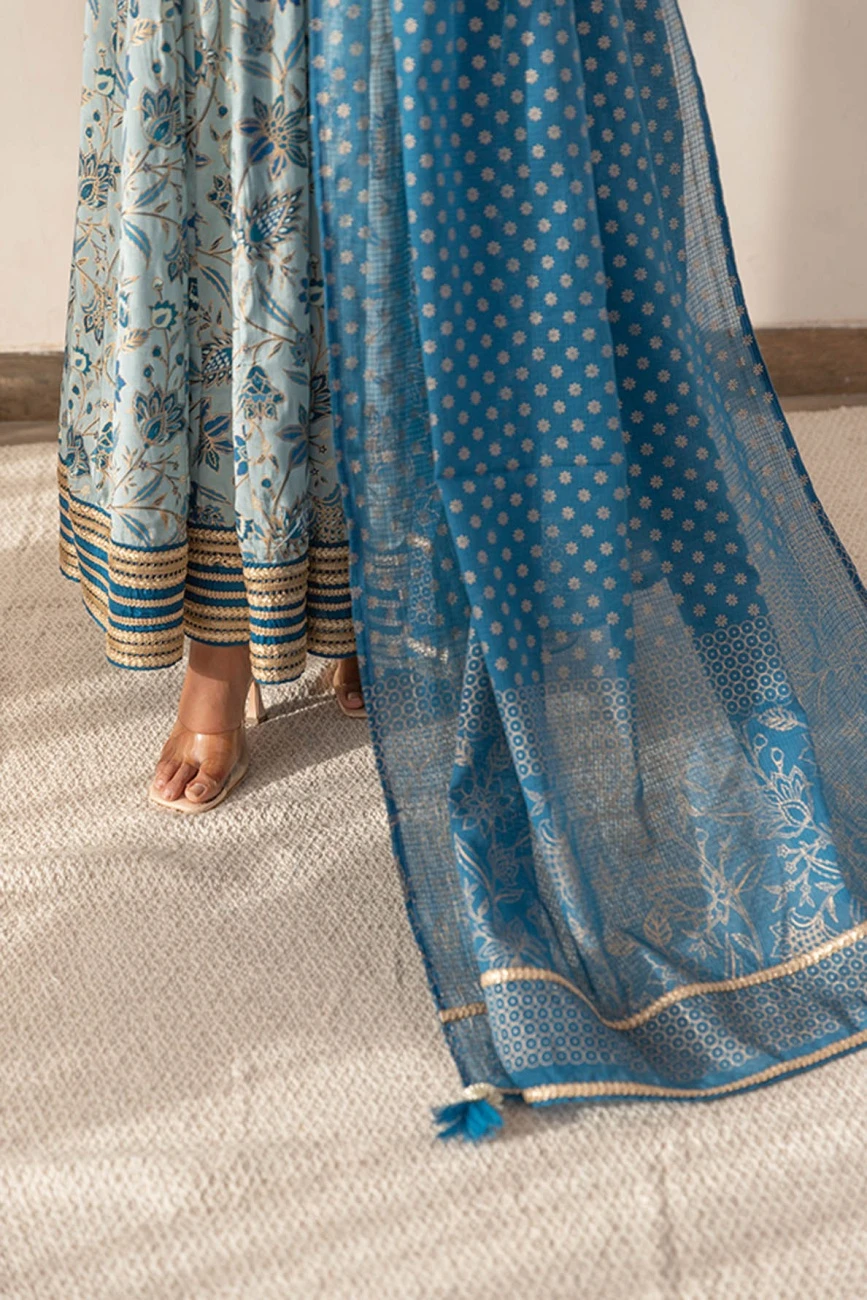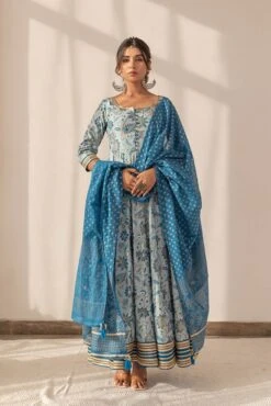 - Blue Floral Printed Anarkali Dress With Dupatta