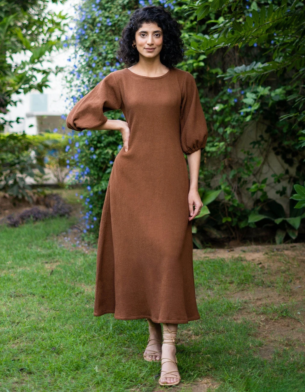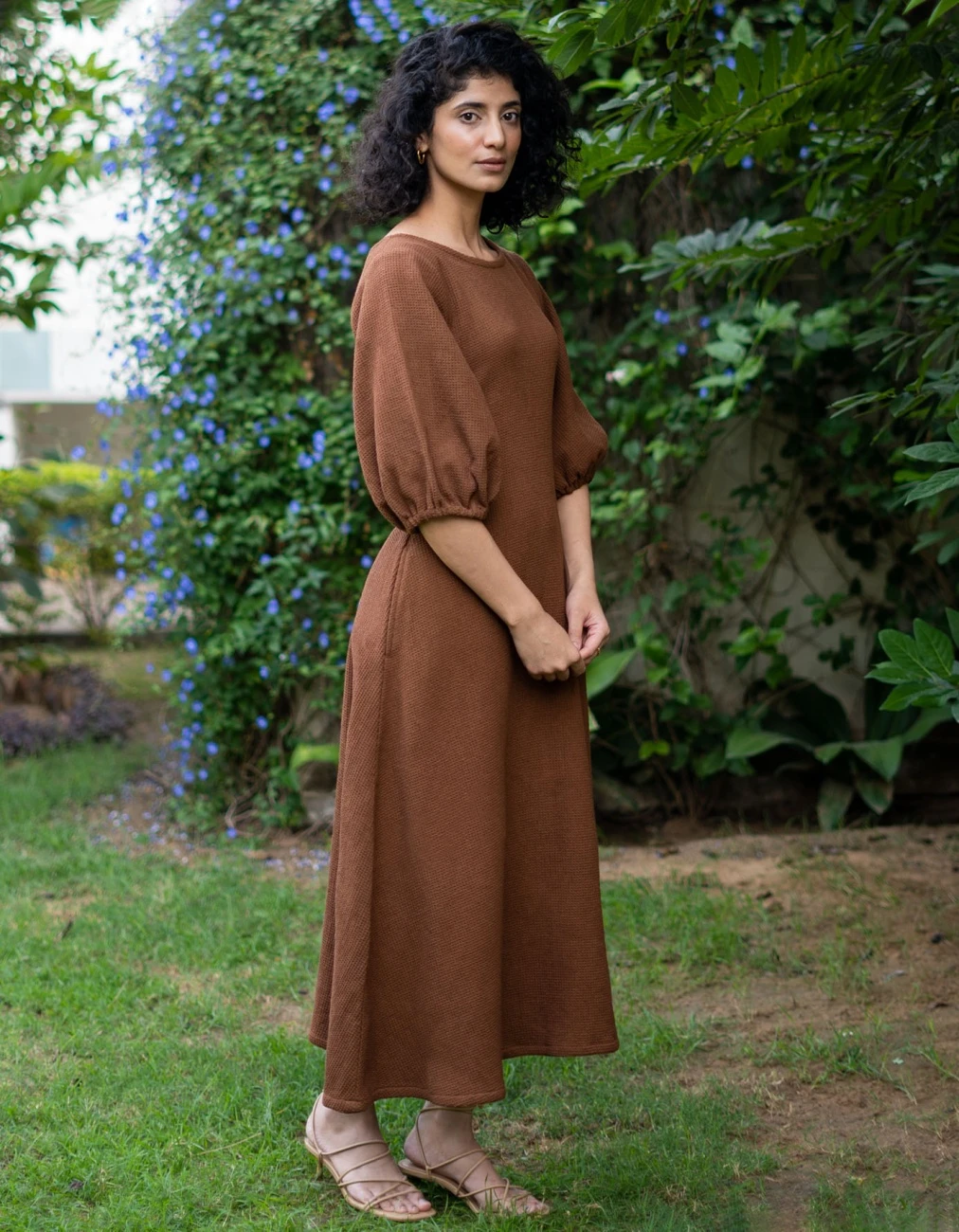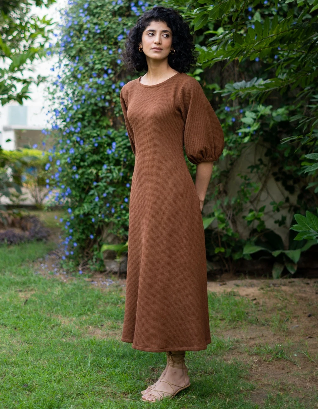 - Brown Warm Cotton Waffle Fit And Flare Balloon Sleeves Maxi Dress