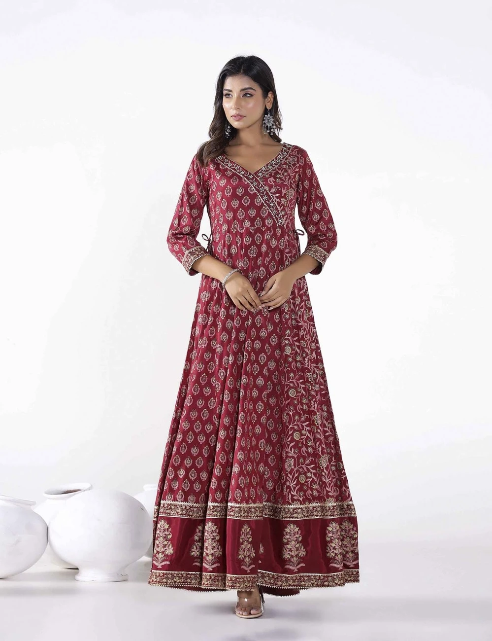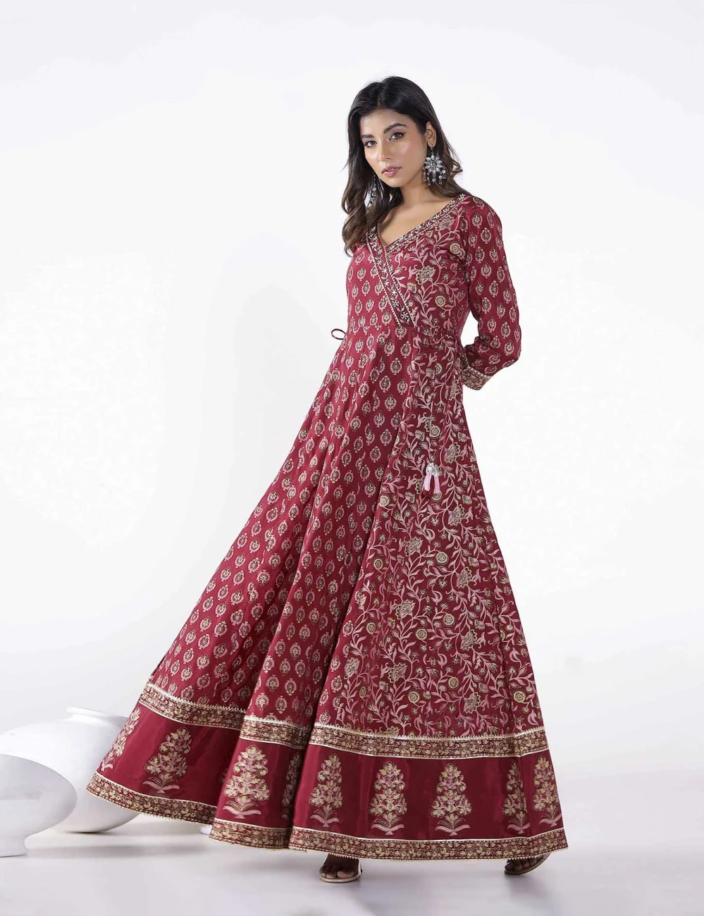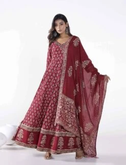 - FLORAL BUTI PRINTED LONG ANARKALI DRESS WITH PANTS AND PRINTED DORIYA DUPATTA