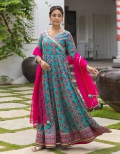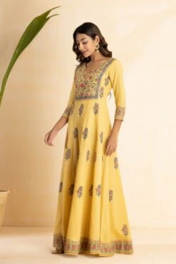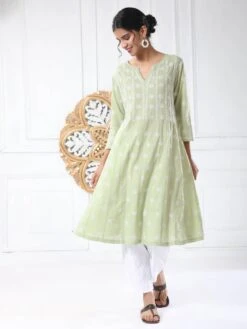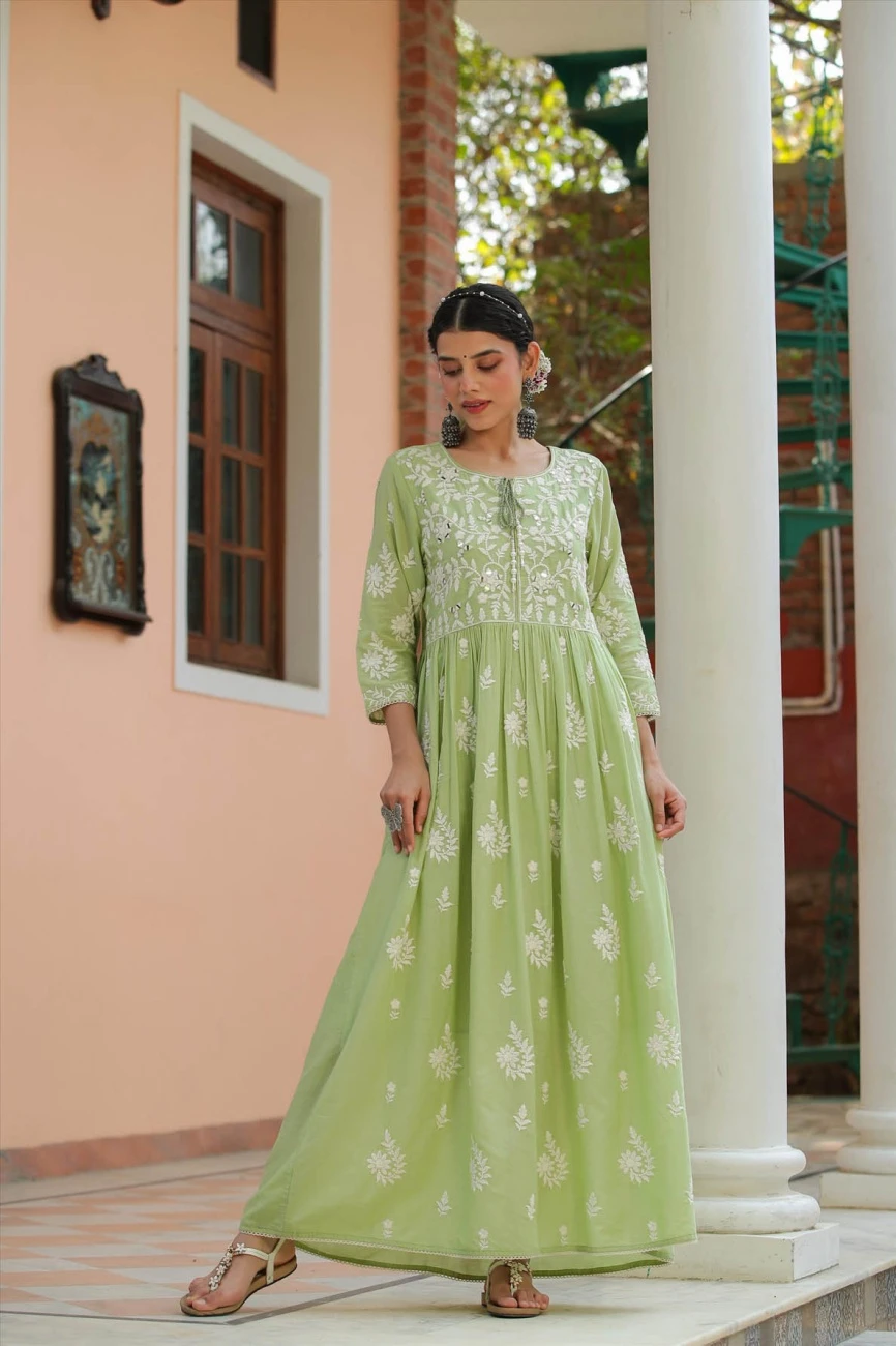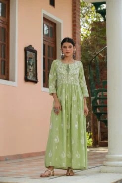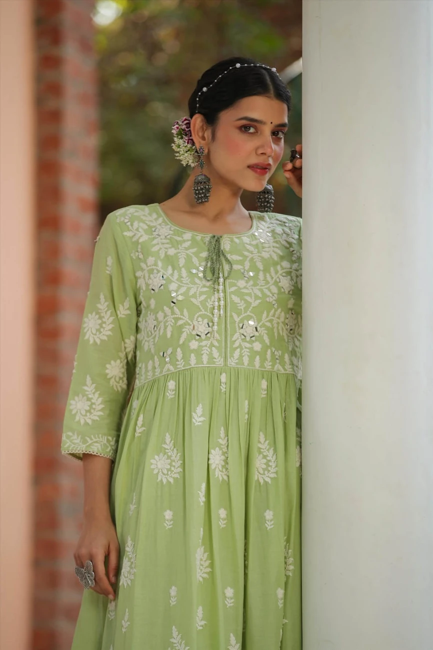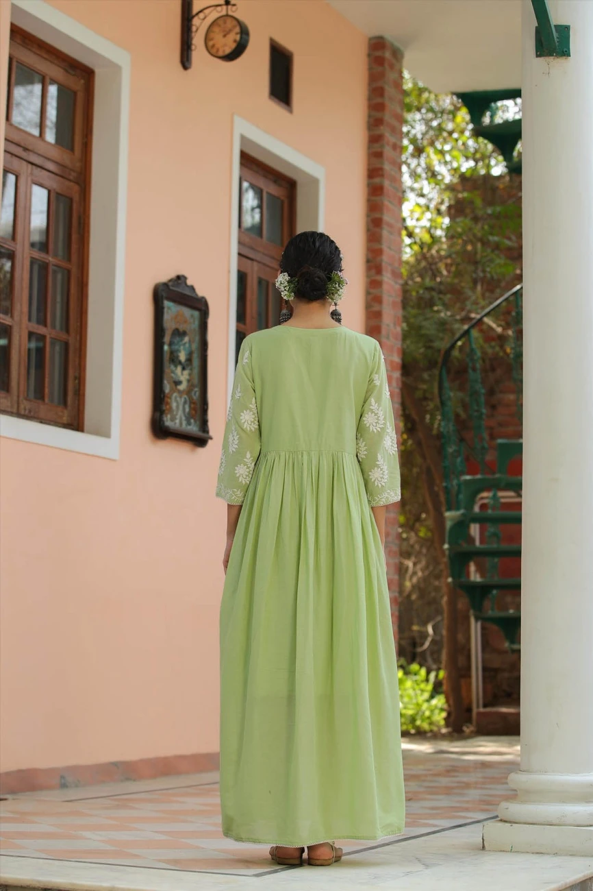 - Green Mul Cotton Chikankari Embroidery Empire Ethnic Dress