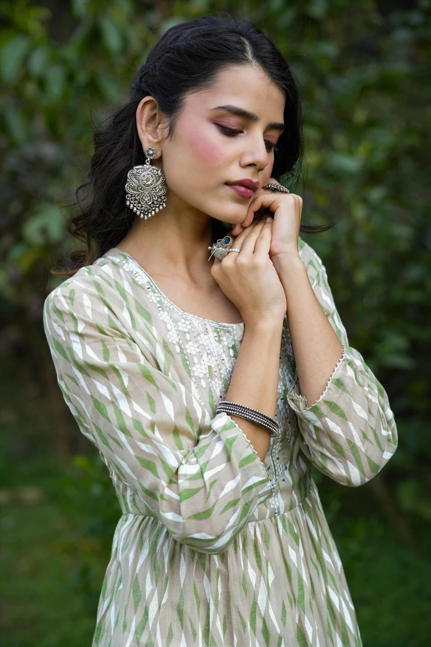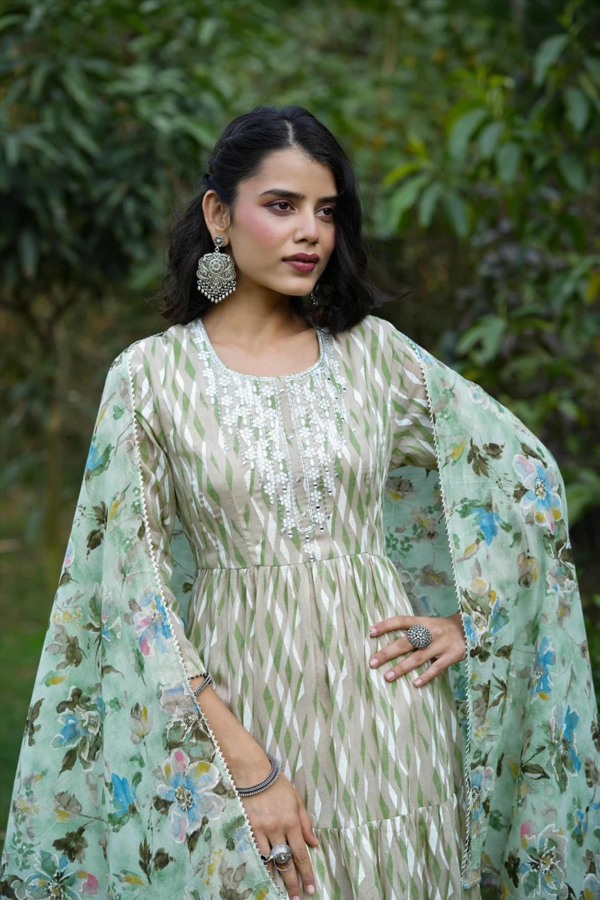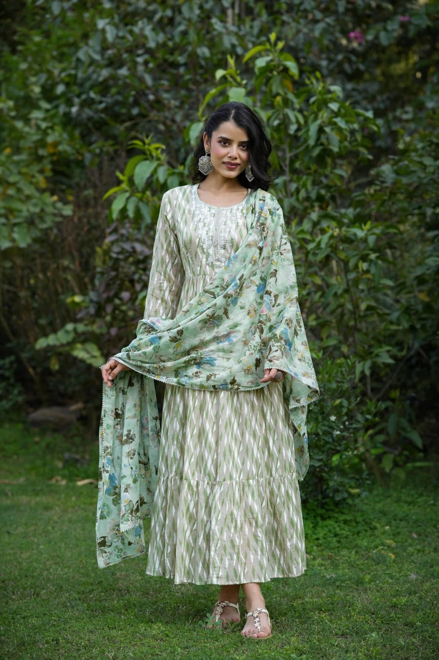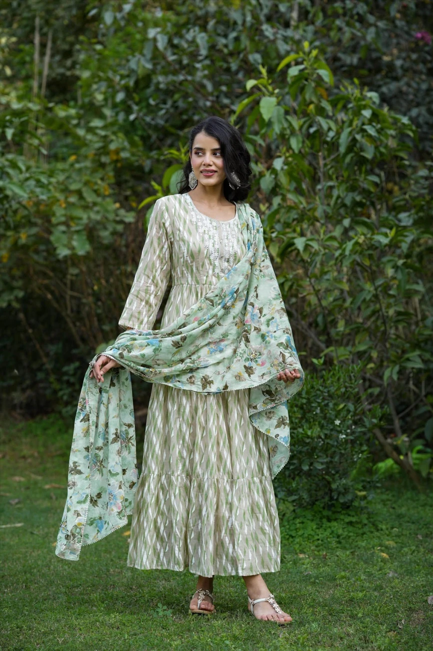 Be the first to review “Green Mul Cotton Printed Tiered Ethnic Dress With Mul Cotton Dupatta” Cancel reply