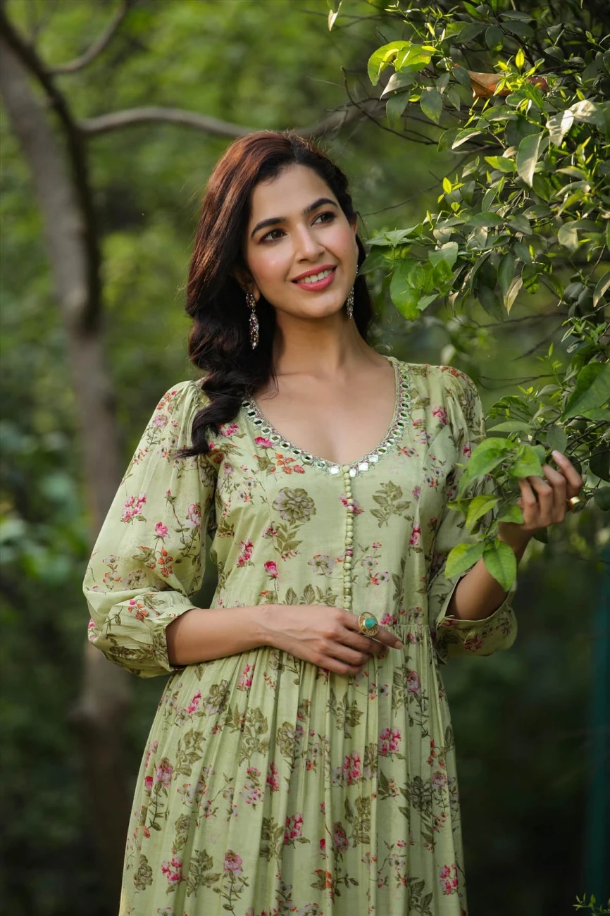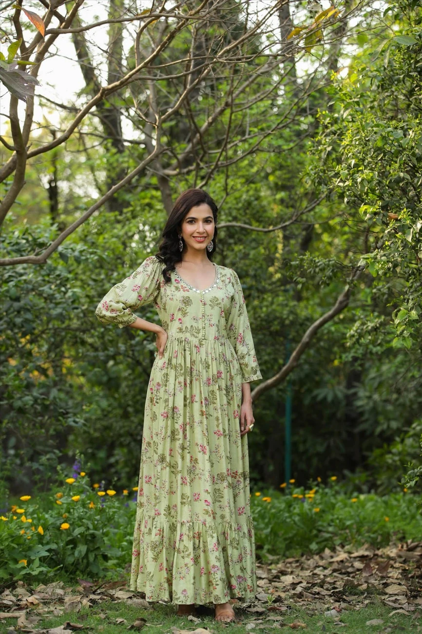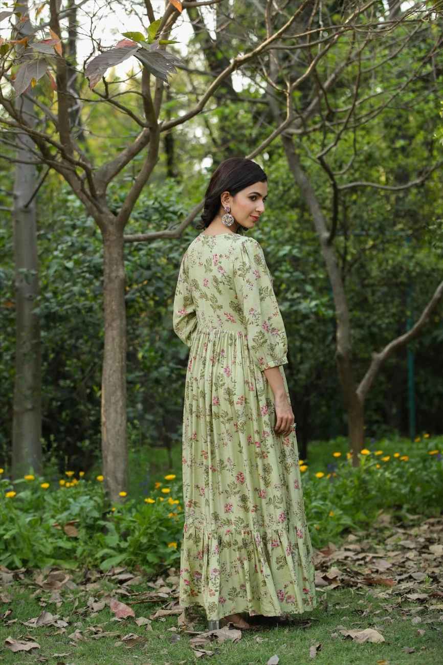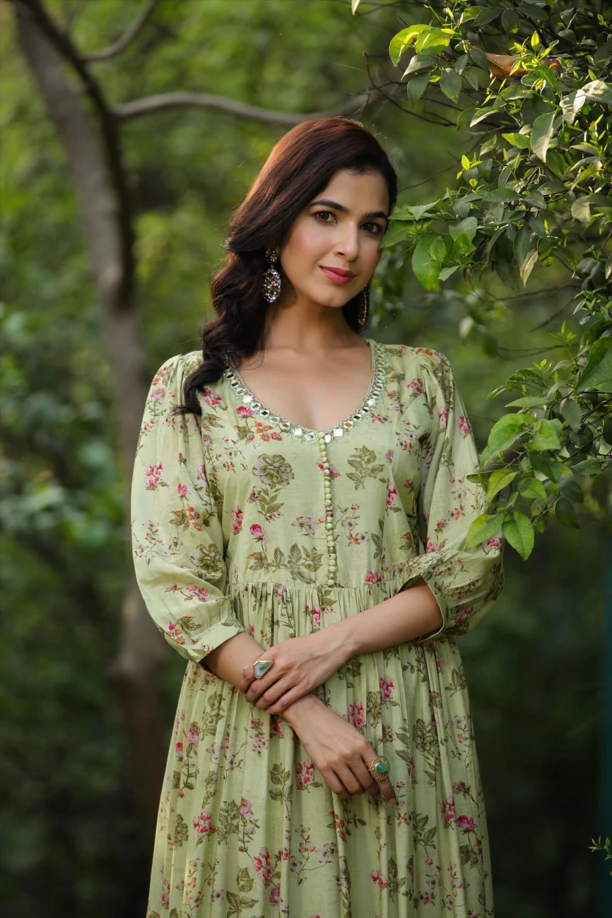 - Green Muslin Silk Floral Print Pleated Anarkali Dress With Lining