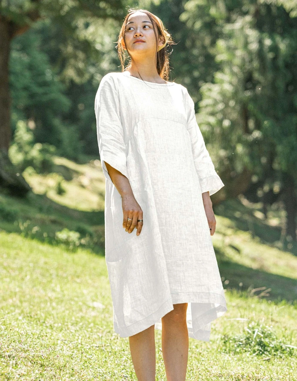 - Dress with pockets on both sides with thread detailing on neckline, sleeves, hem and pockets