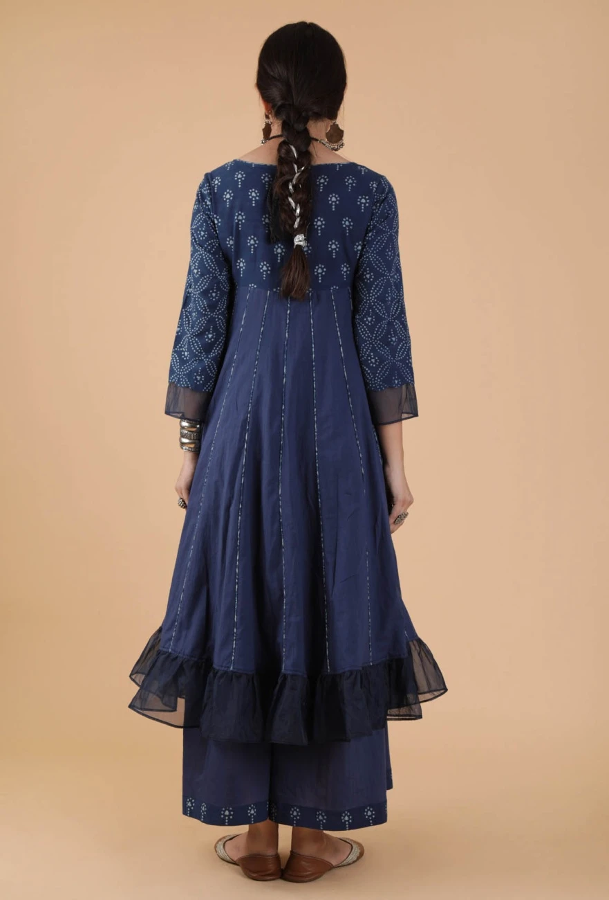 - Kaira Indigo Buti & Jaal Printed Anarkali Dress With Organza Detailing
