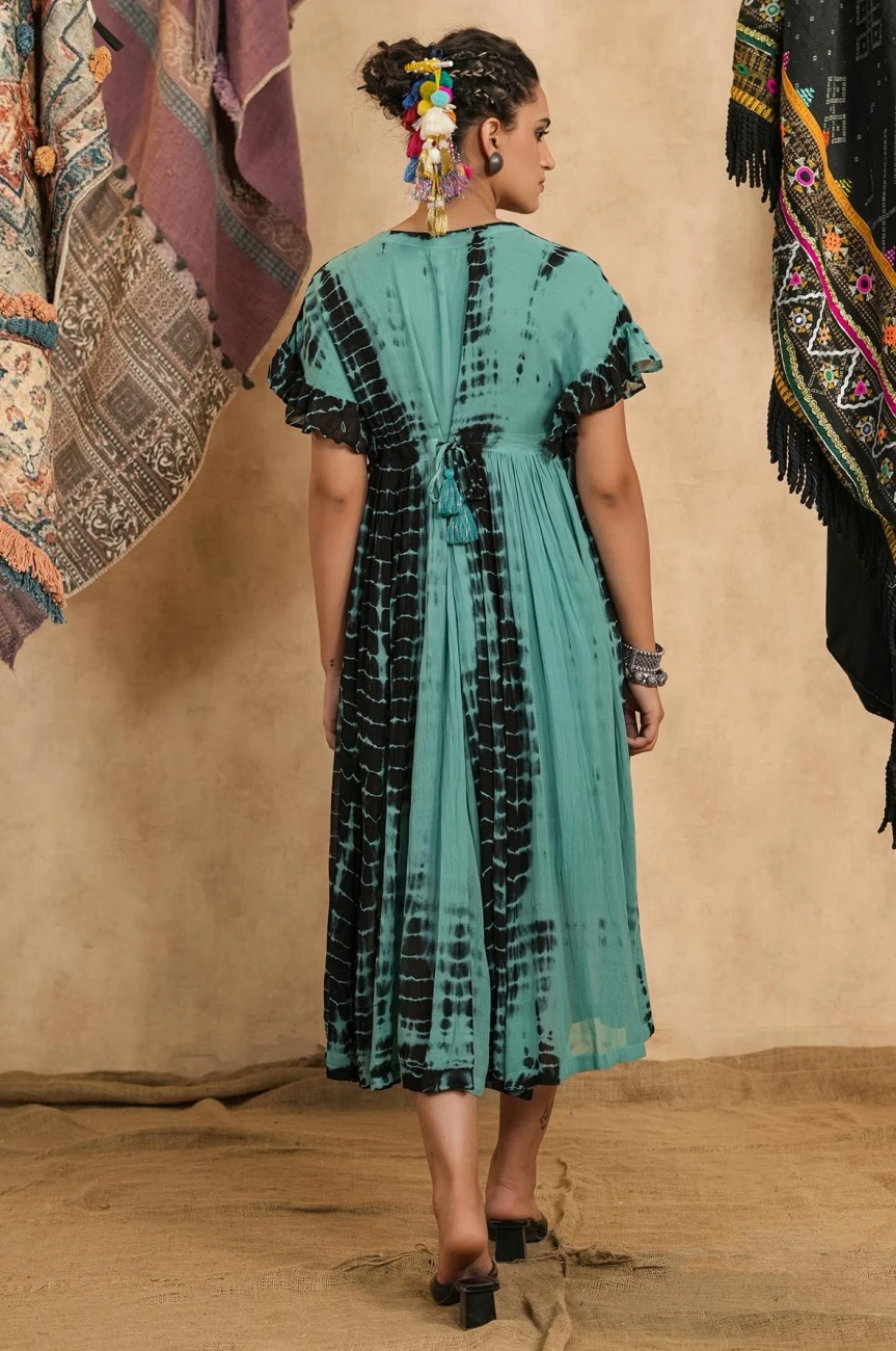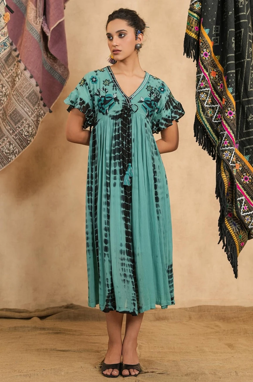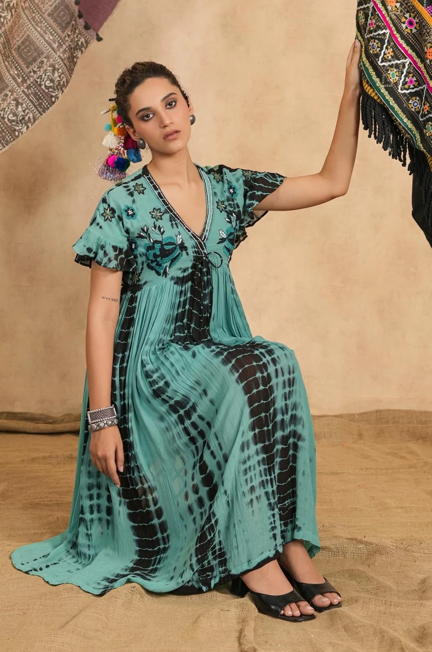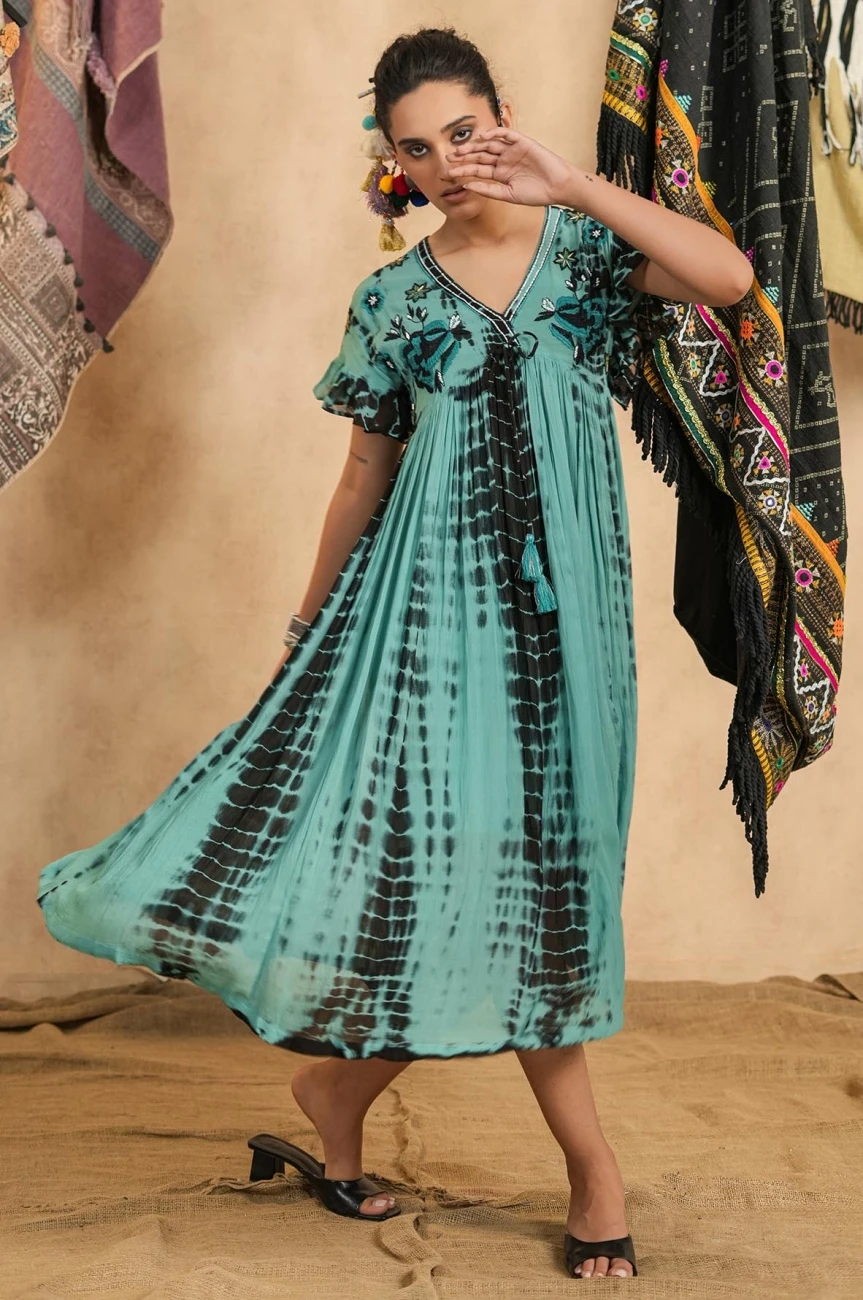 - Light Green Tie-Dye Viscose Georgette Embroidery Dress