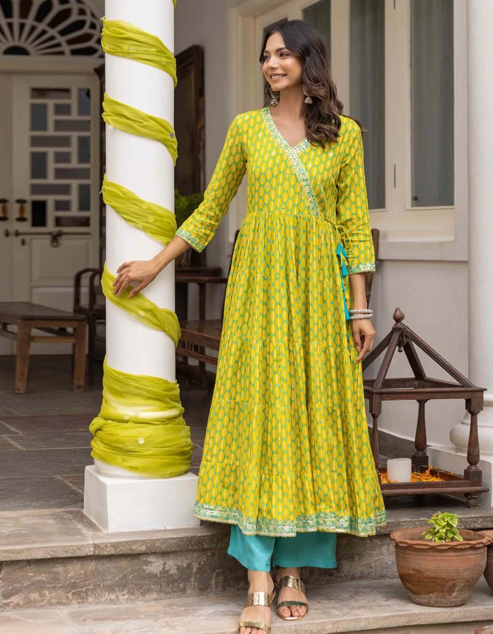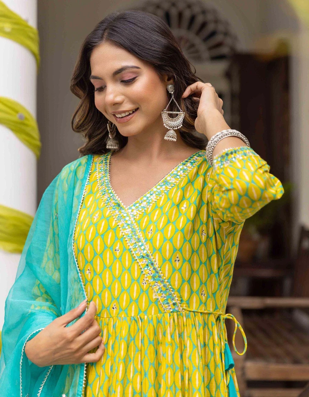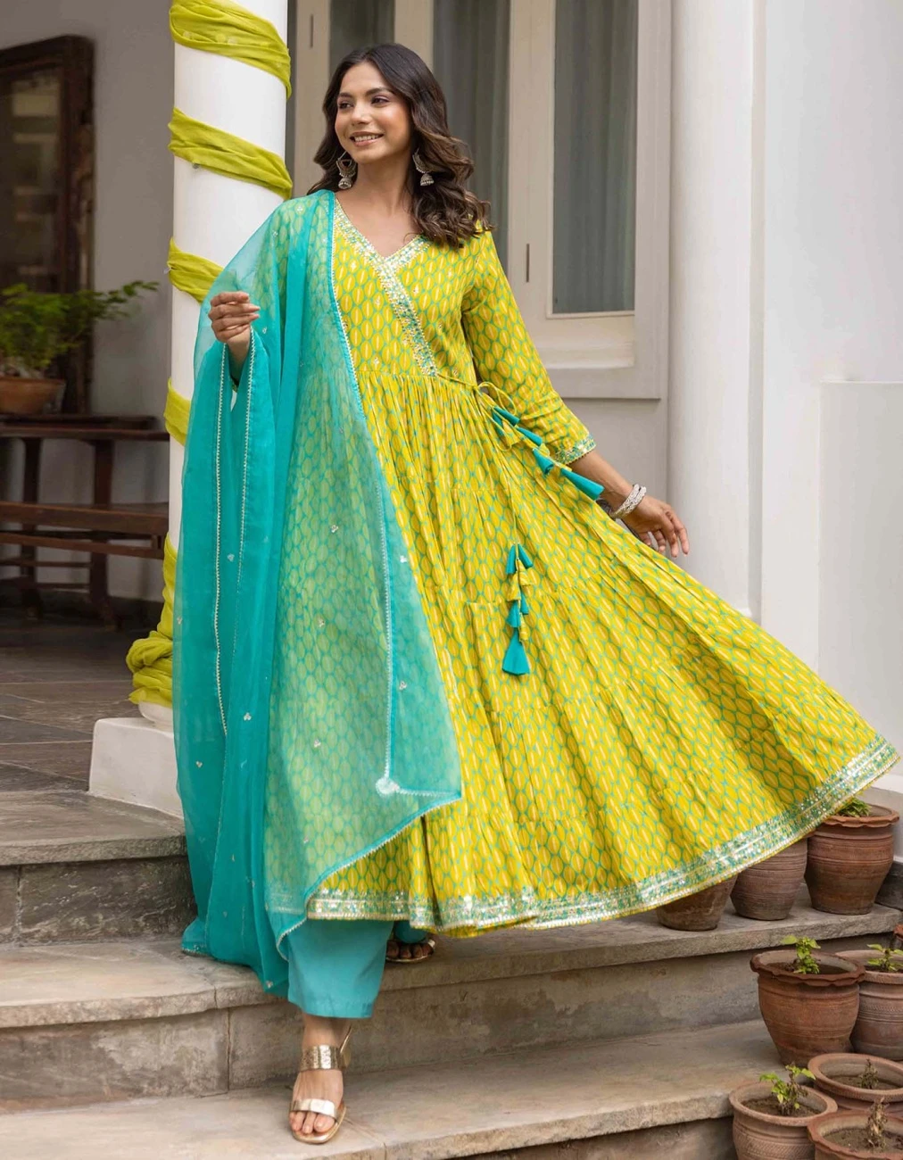- Marigold Yellow And Fuchsia Pink Eye Printed Tiered Dress With Palazzo And Organza Dupatta