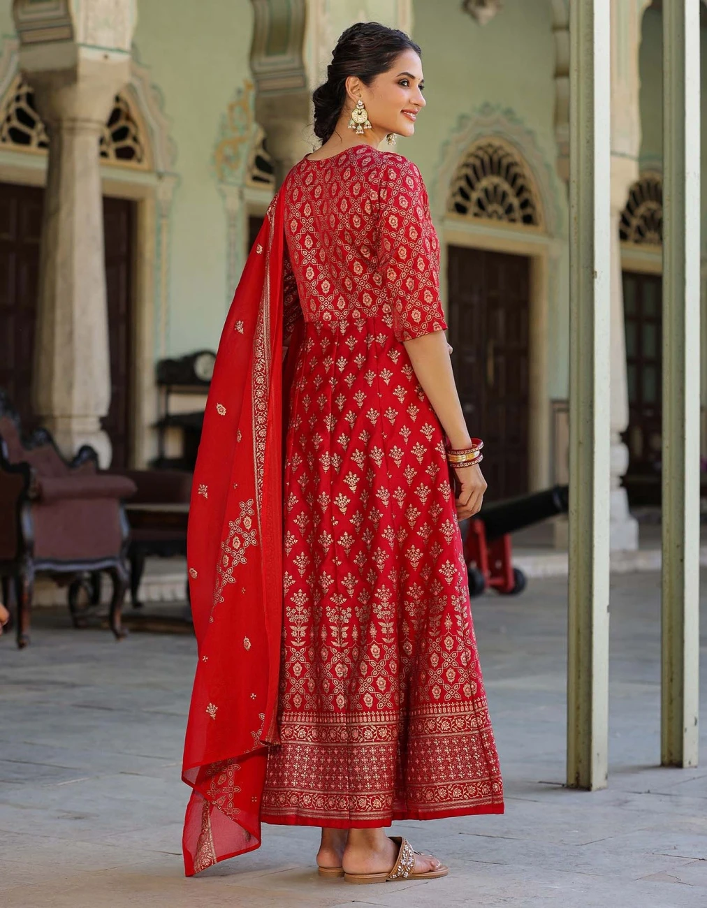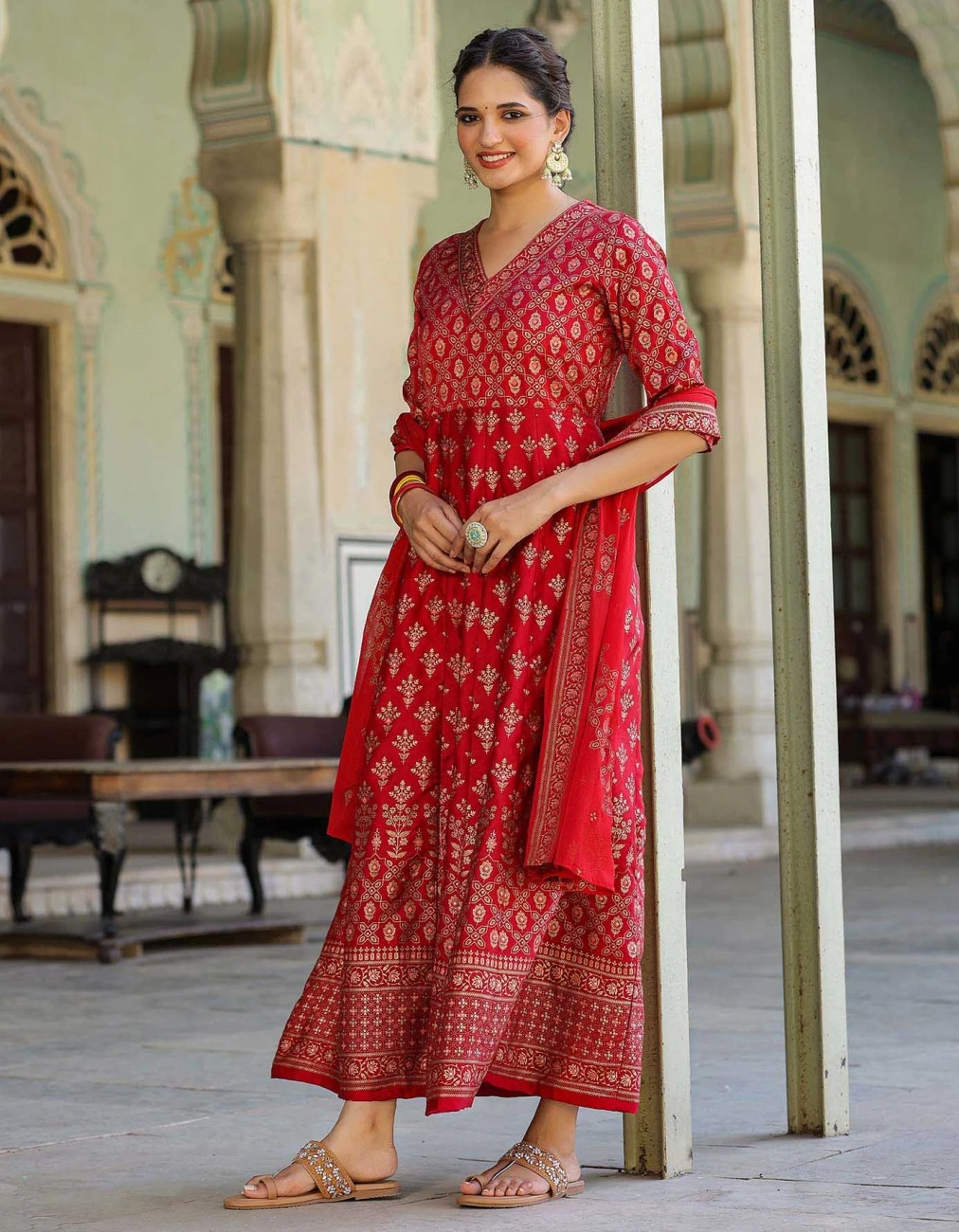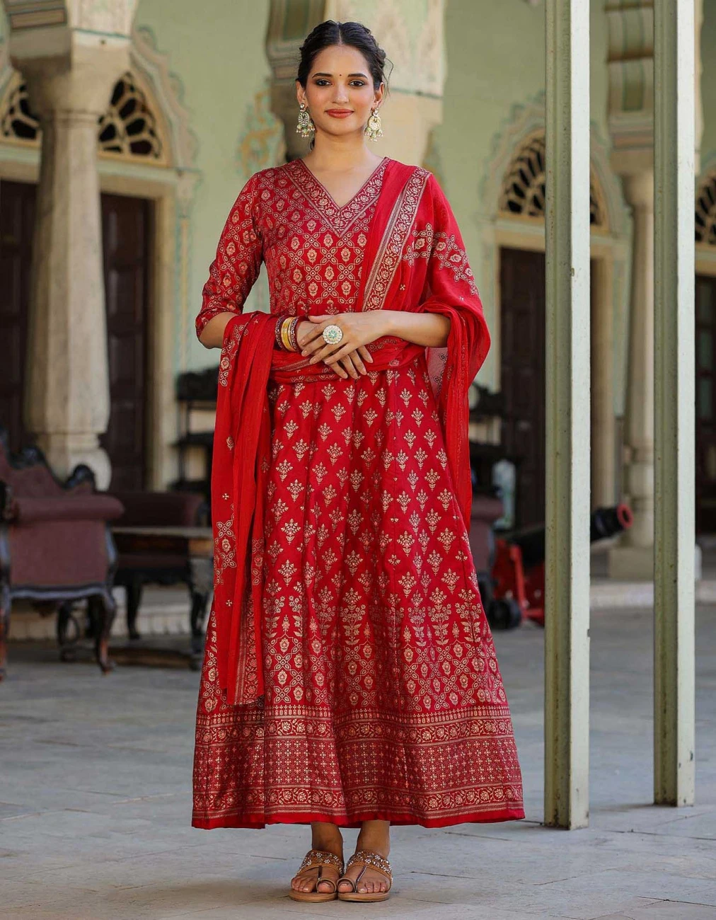 Maroon Korwaki Silk Foil Print Anarkali Ethnic Dress With Dupatta