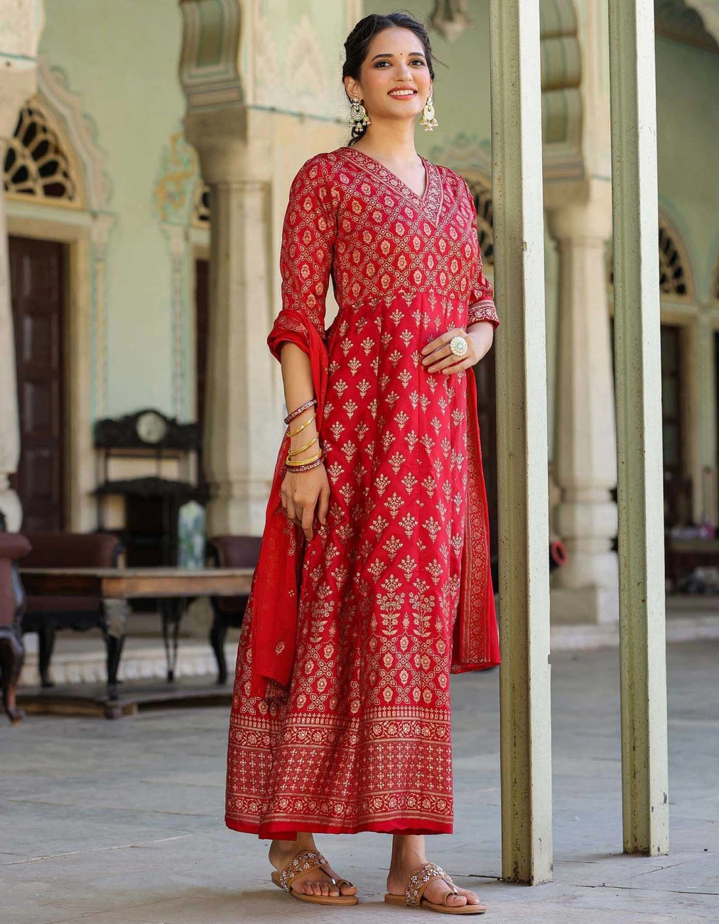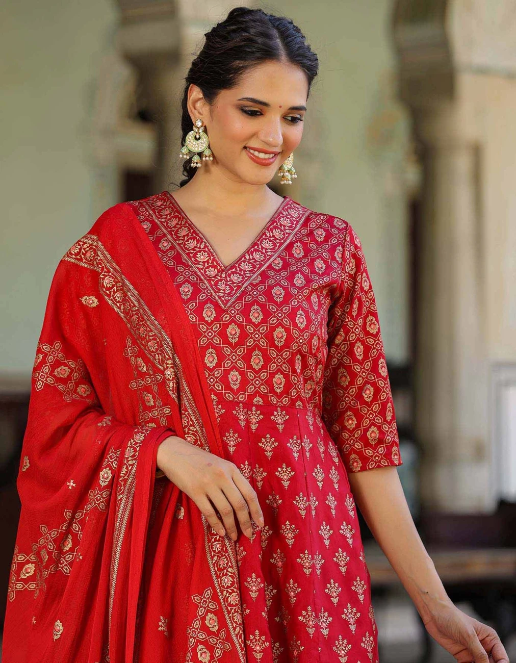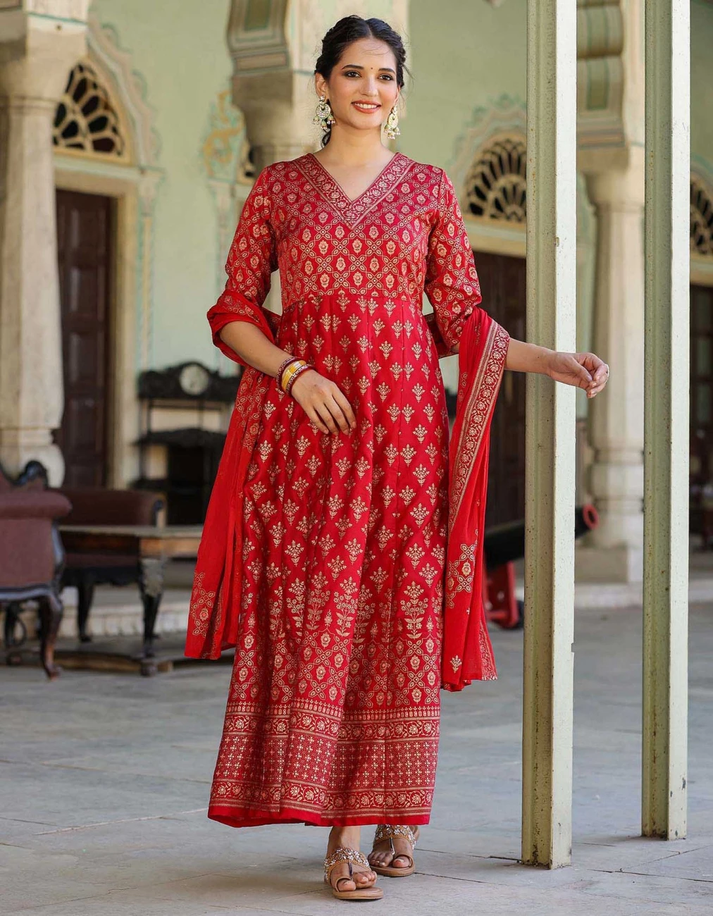 Maroon Korwaki Silk Foil Print Anarkali Ethnic Dress With Dupatta
