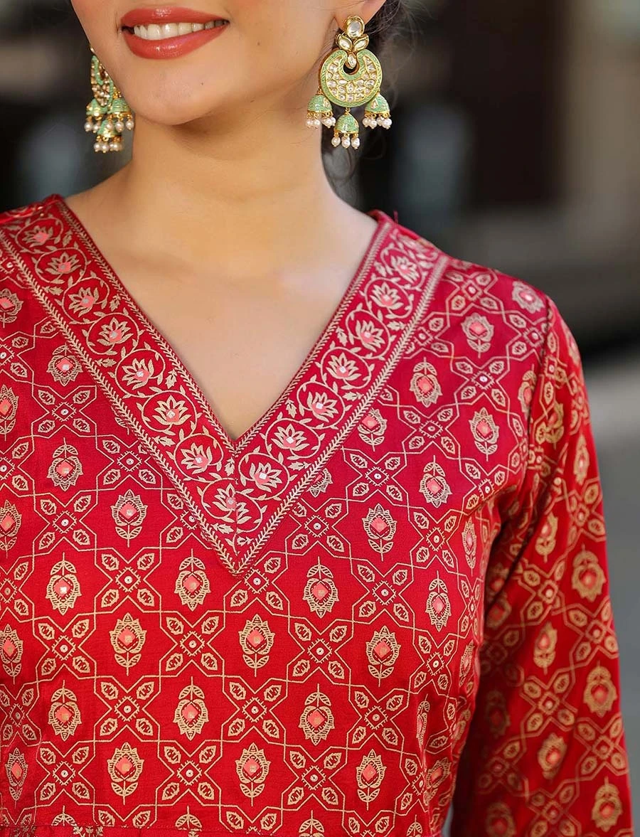 - Maroon Korwaki Silk Foil Print Anarkali Ethnic Dress With Dupatta