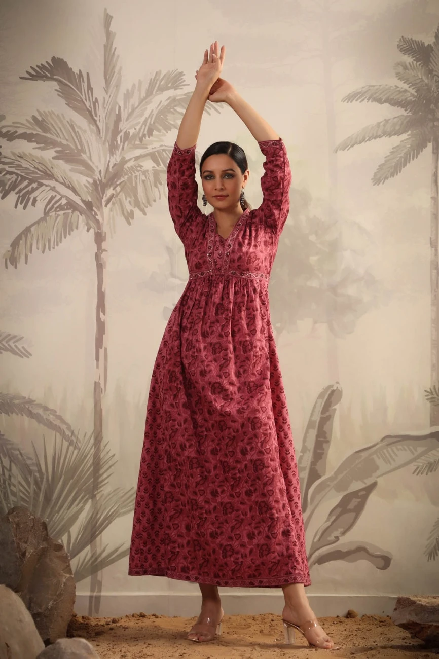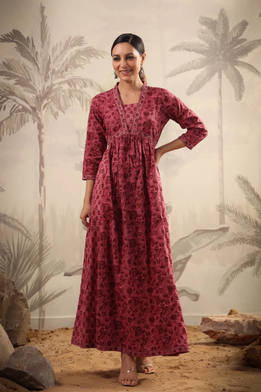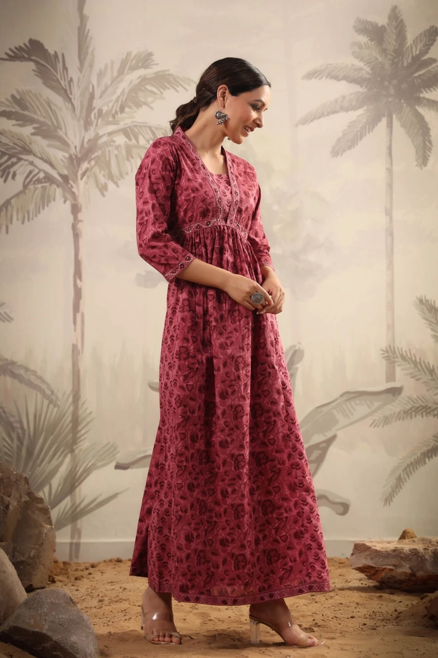 - Mauve Cotton Printed Panelled Ethnic Dress