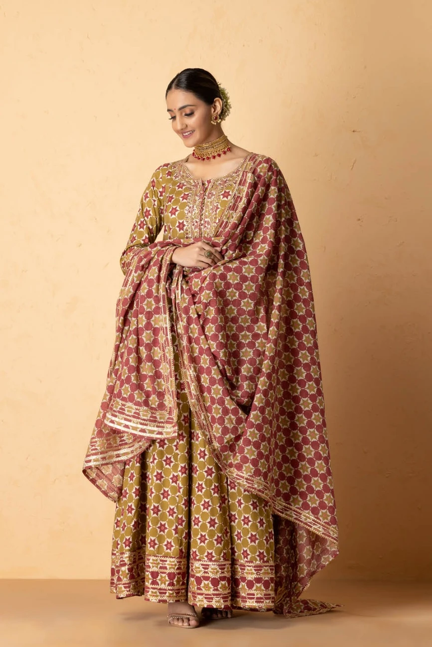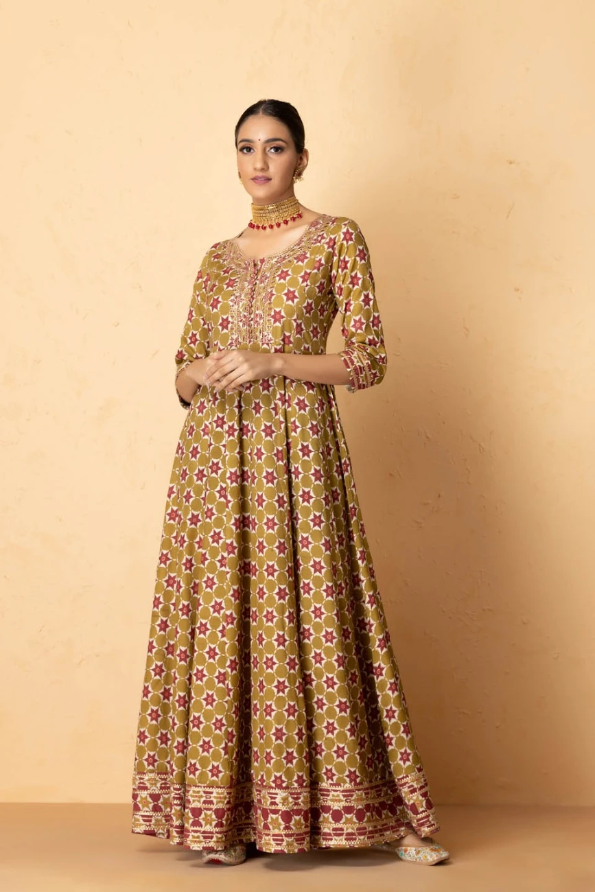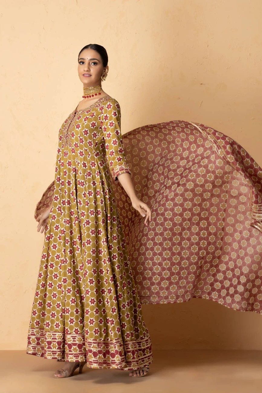 Mehndi Green Abstract Printed Maxi Dress With Printed Dupatta