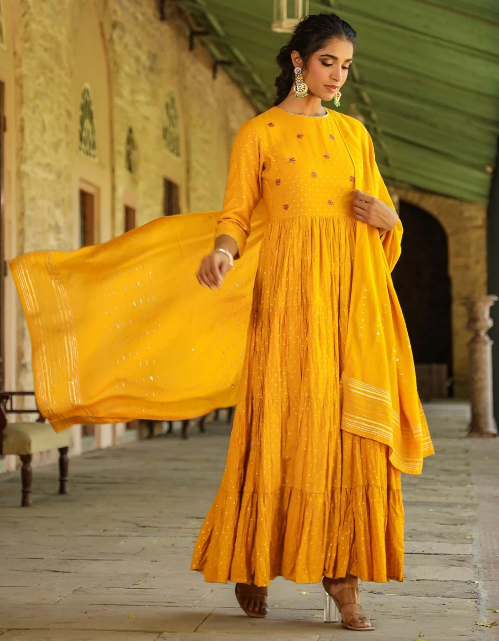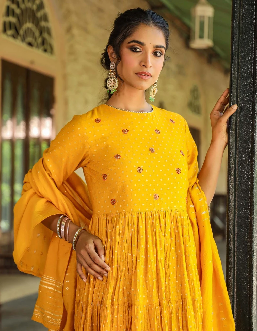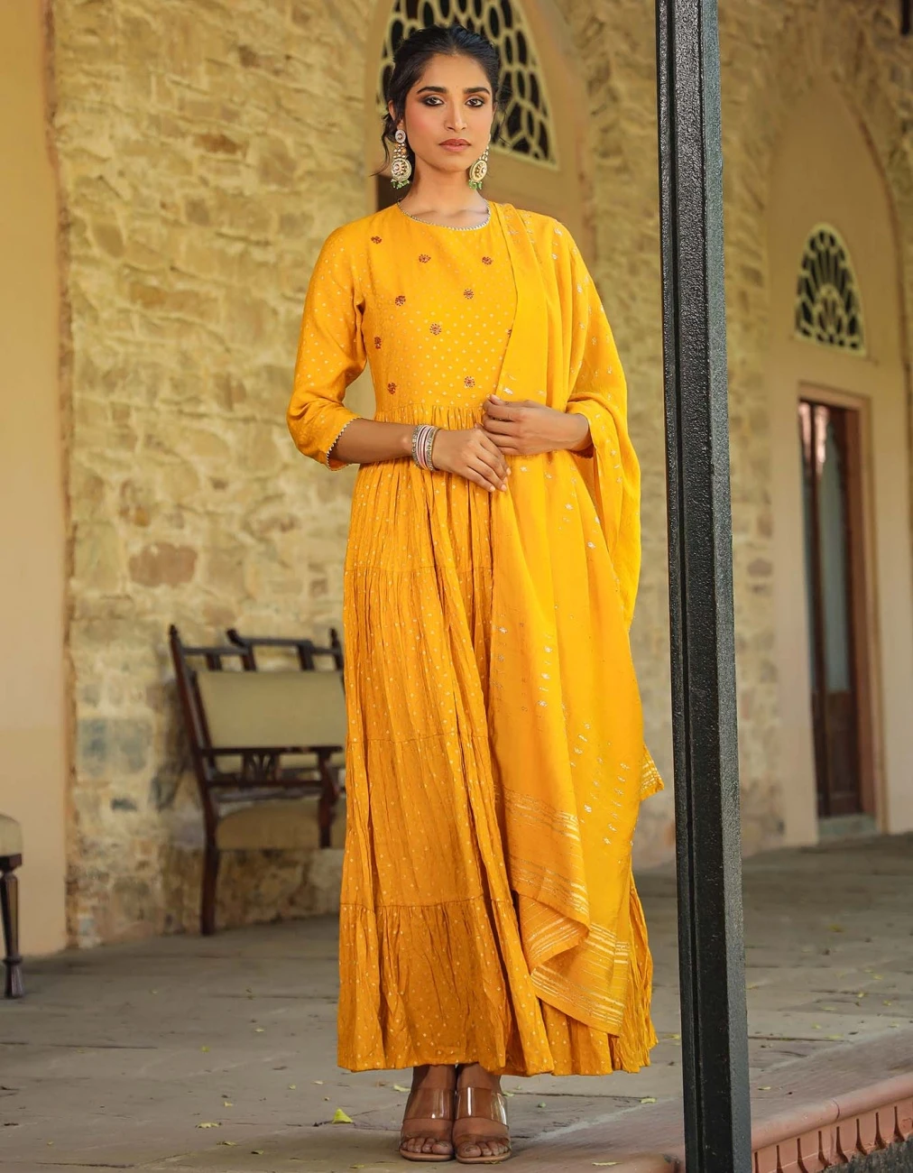 - Mustard Cotton Jacquard Embellished Tiered Ethnic Dress With Dupatta