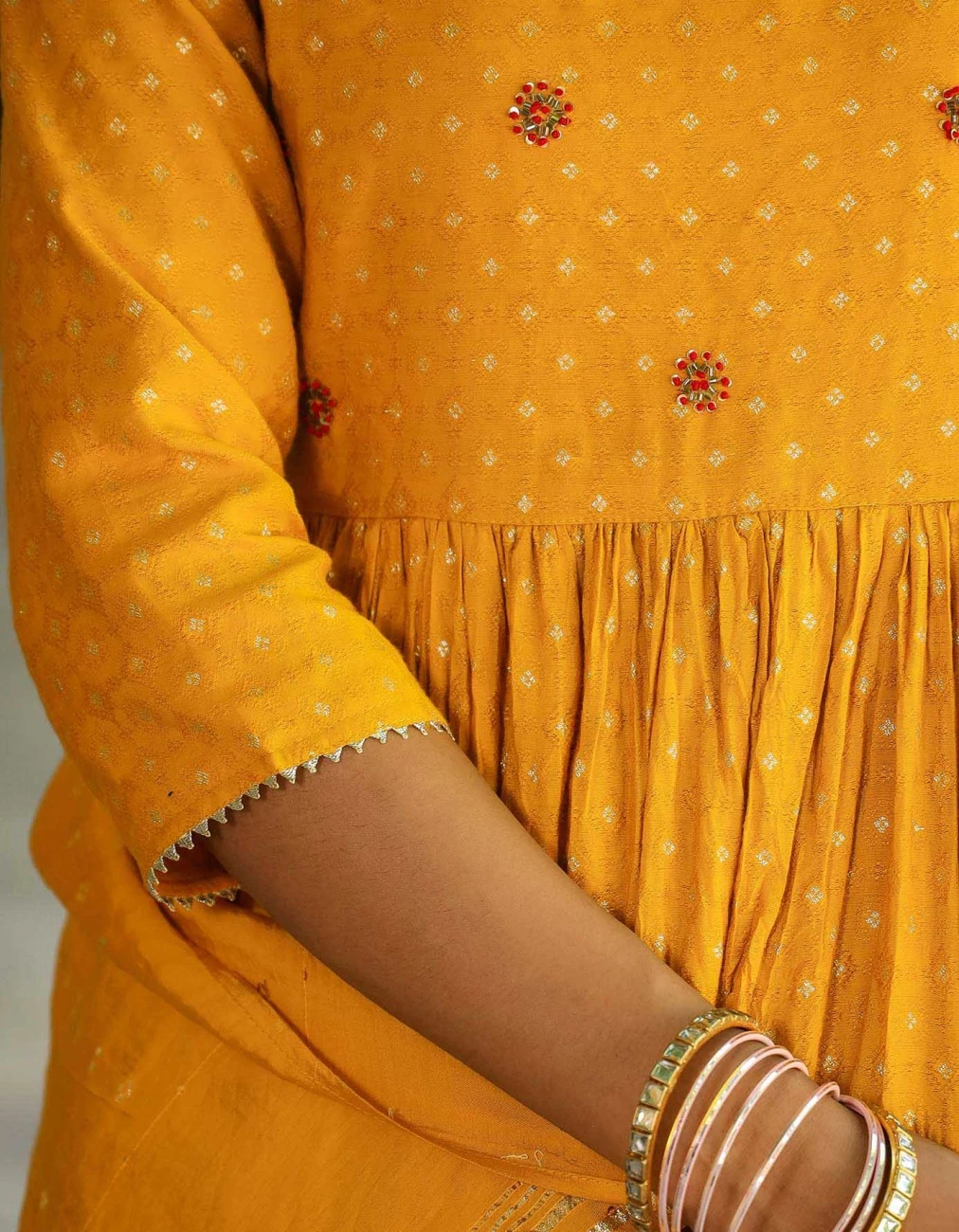 - Fabric- Top: Cotton Jacquard; Dupatta: Chanderi Kakadia; Lining: Cotton Voile