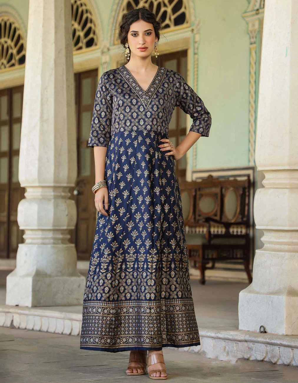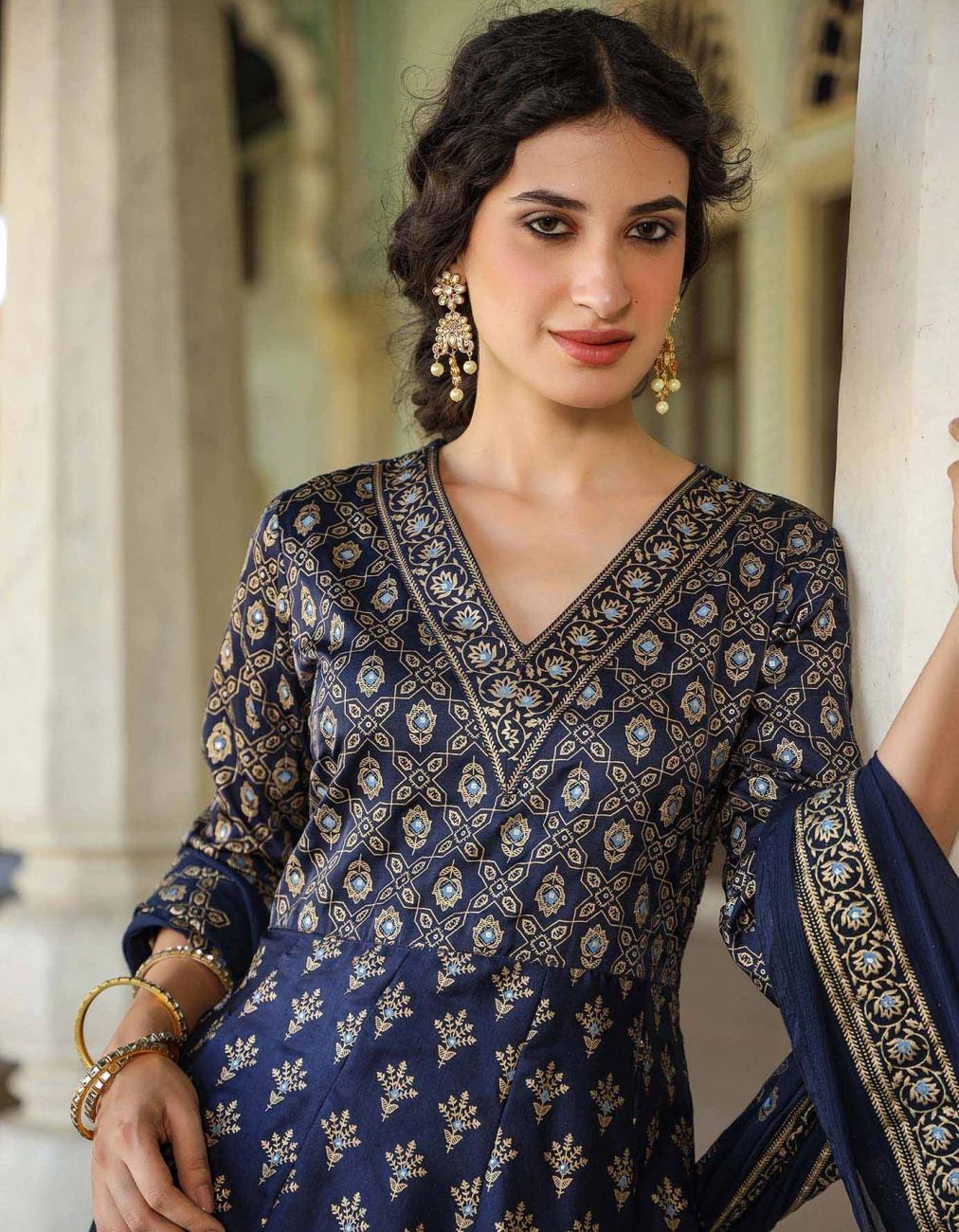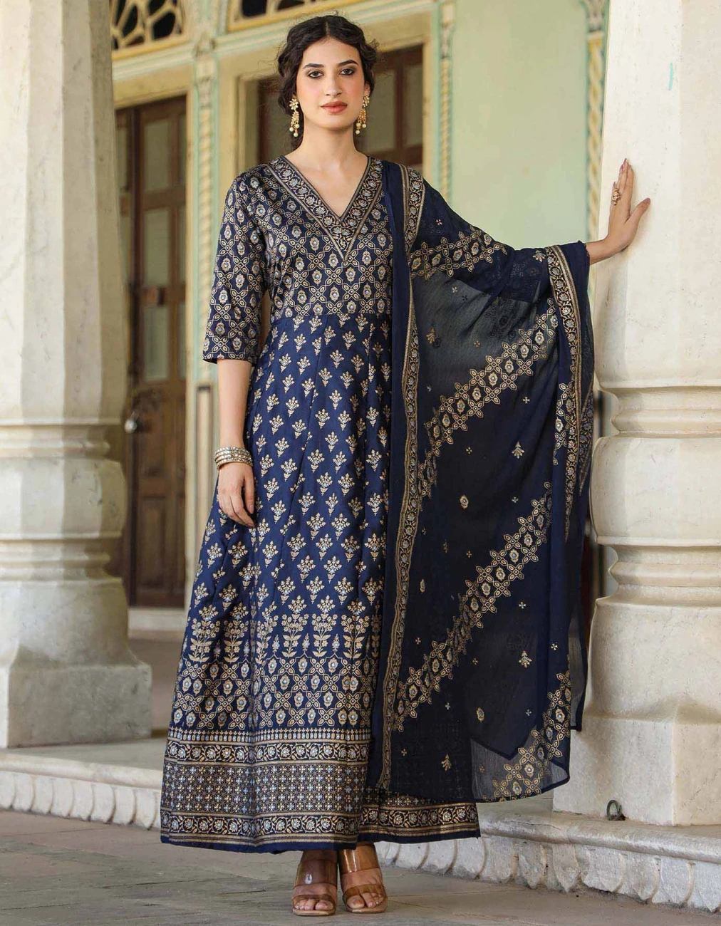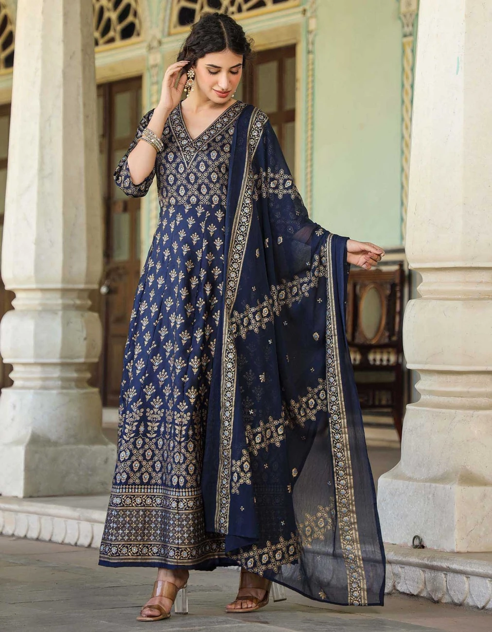 - Navy Korwaki Silk Foil Print Anarkali Ethnic Dress With Dupatta