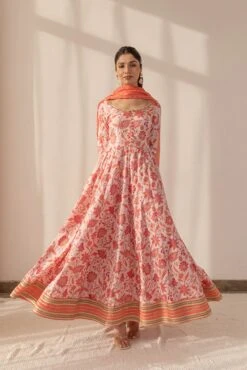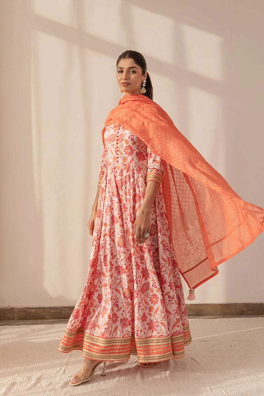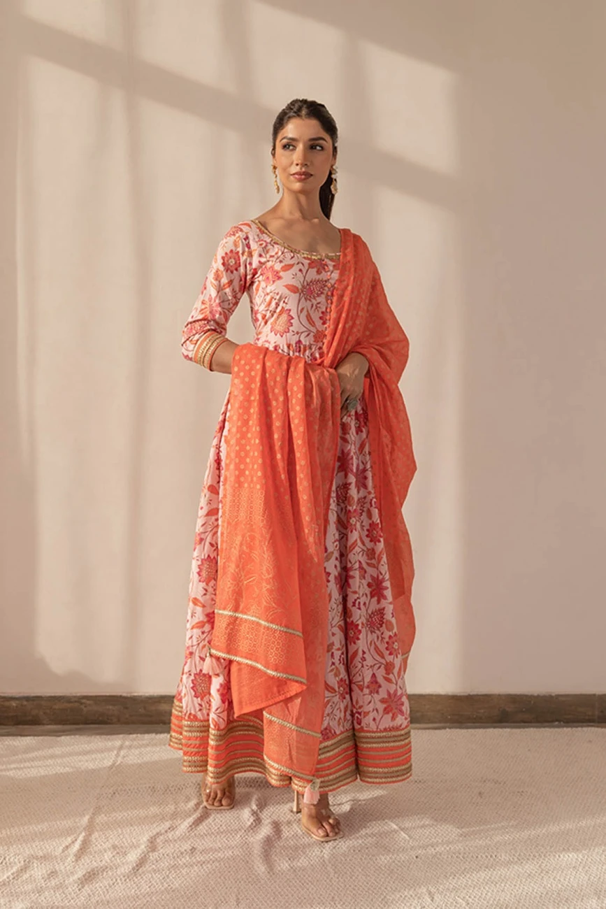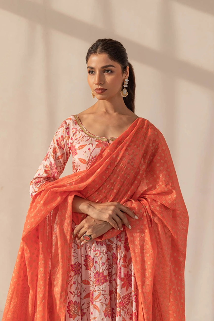 - Orange Floral Printed Anarkali Dress With Dupatta