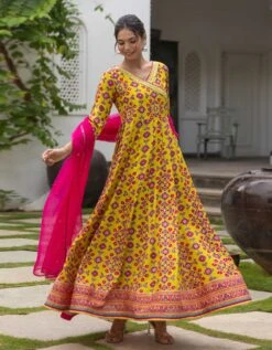 - Patola Yellow Anarkali Long Dress With Organza Dupatta