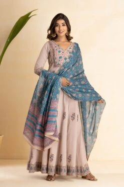 - Peach Hand Block Printed Long Dress With Printed Floral Dupatta