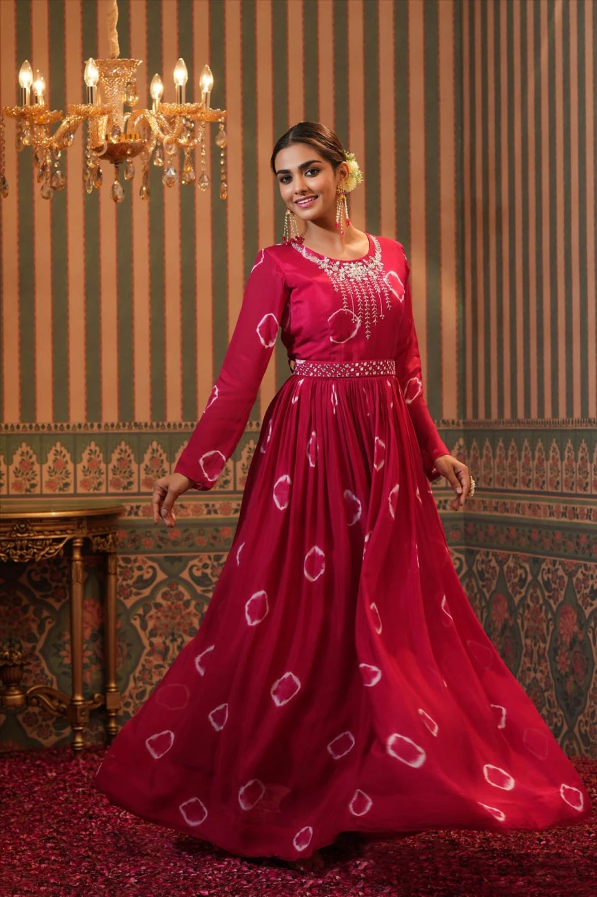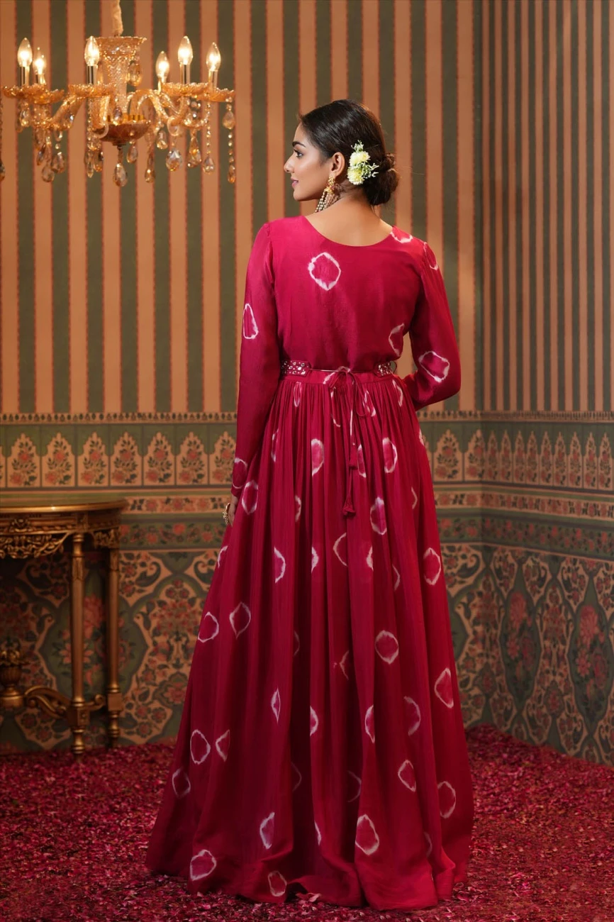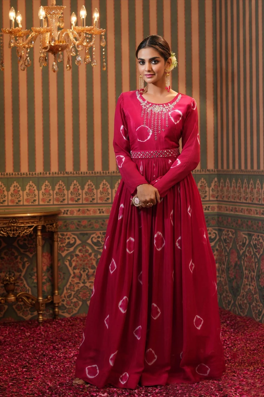 - PINK CHINON SILK SHIBORI PRINT ANARKALI DRESS WITH EMBROIDERED BELT