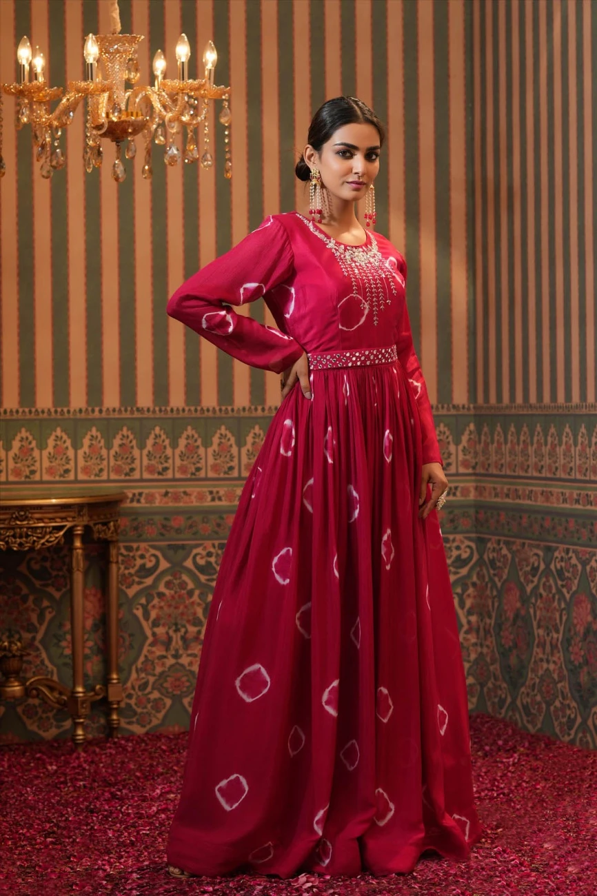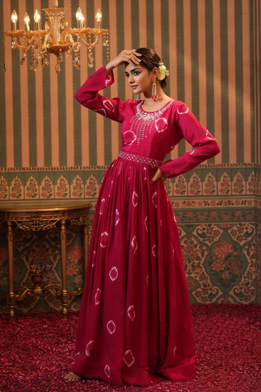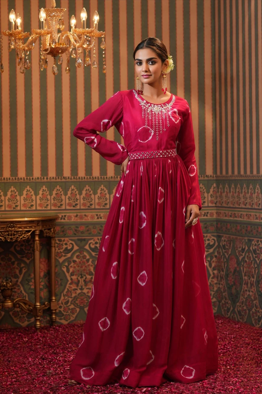 - PINK CHINON SILK SHIBORI PRINT ANARKALI DRESS WITH EMBROIDERED BELT