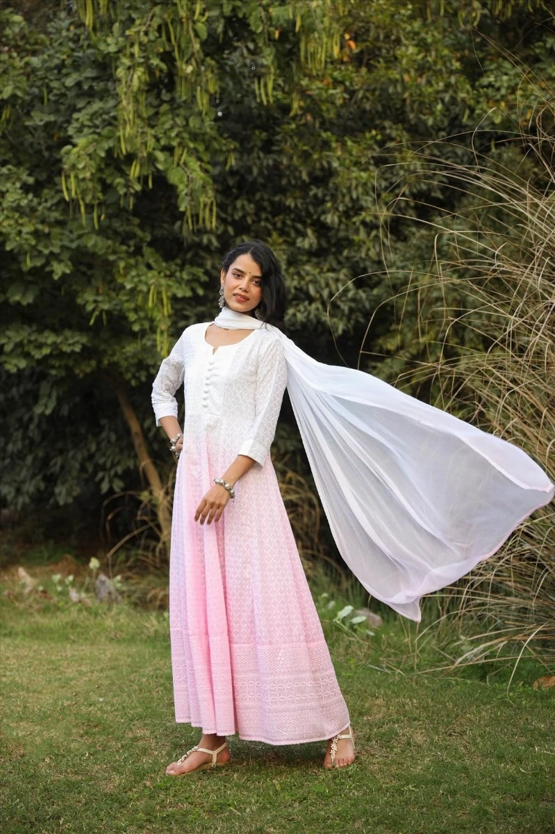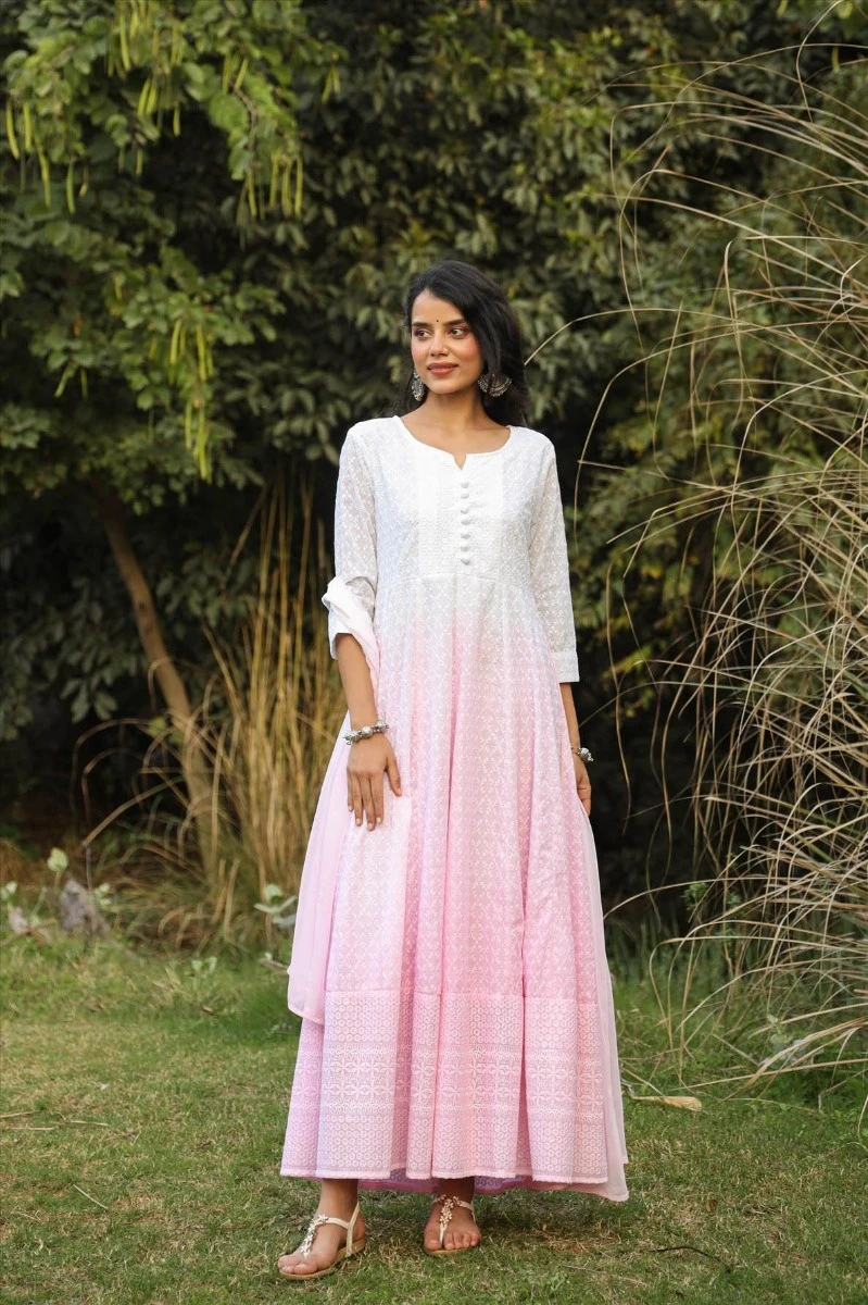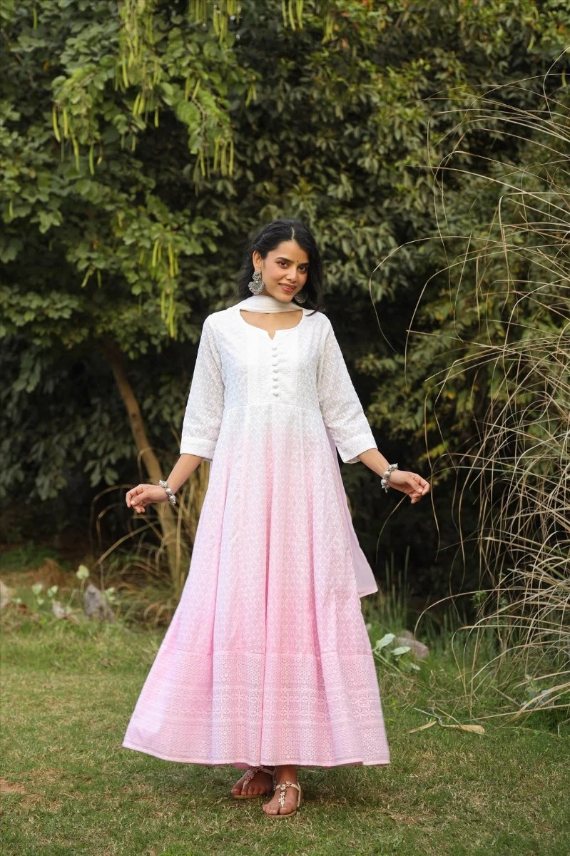 - Pink Cotton Chikankari Ombre Anarkali Ethnic Dress With Tie And Dye Chiffon Dupatta
