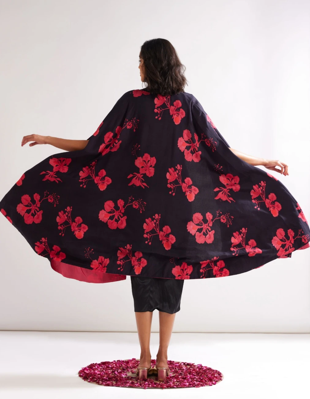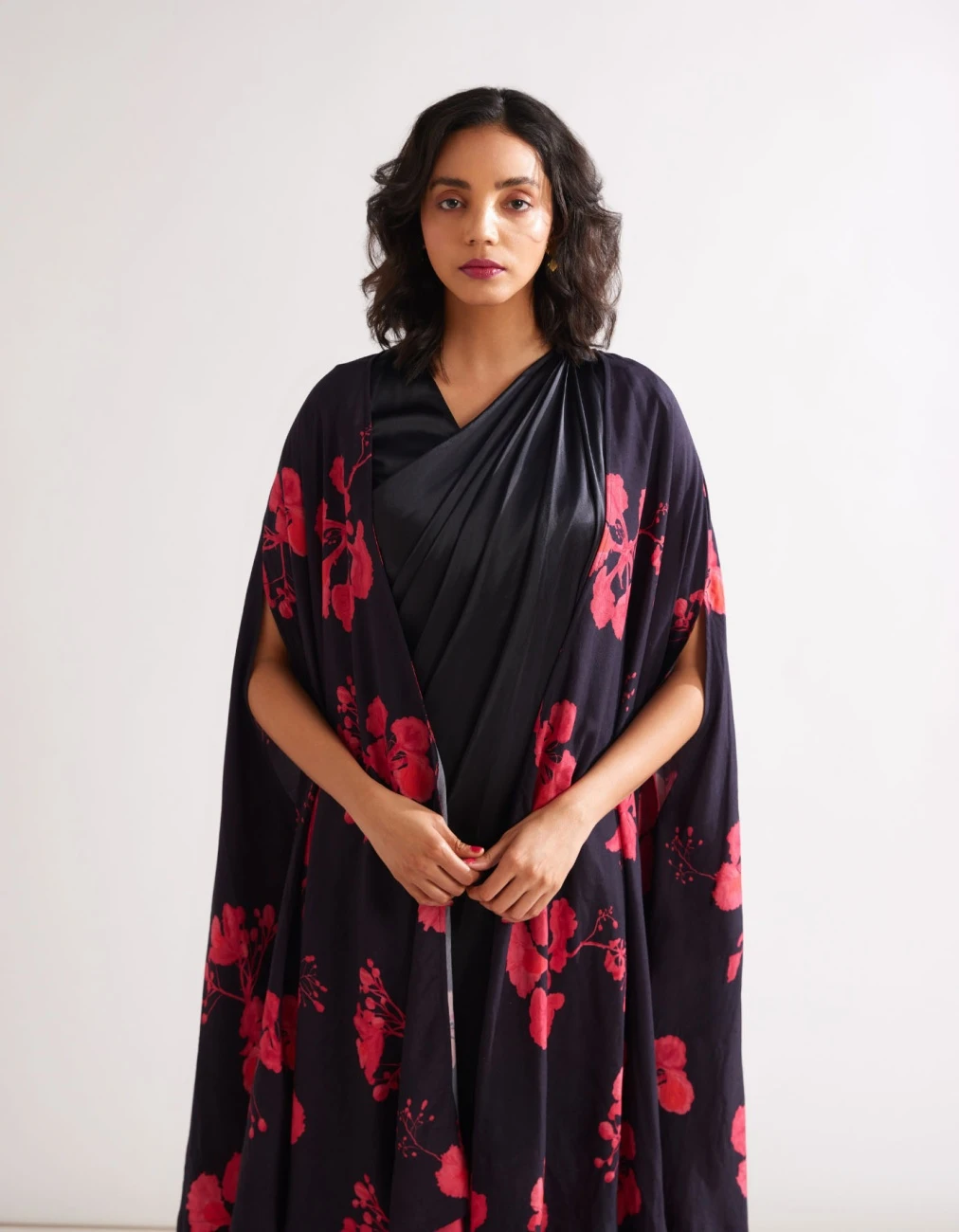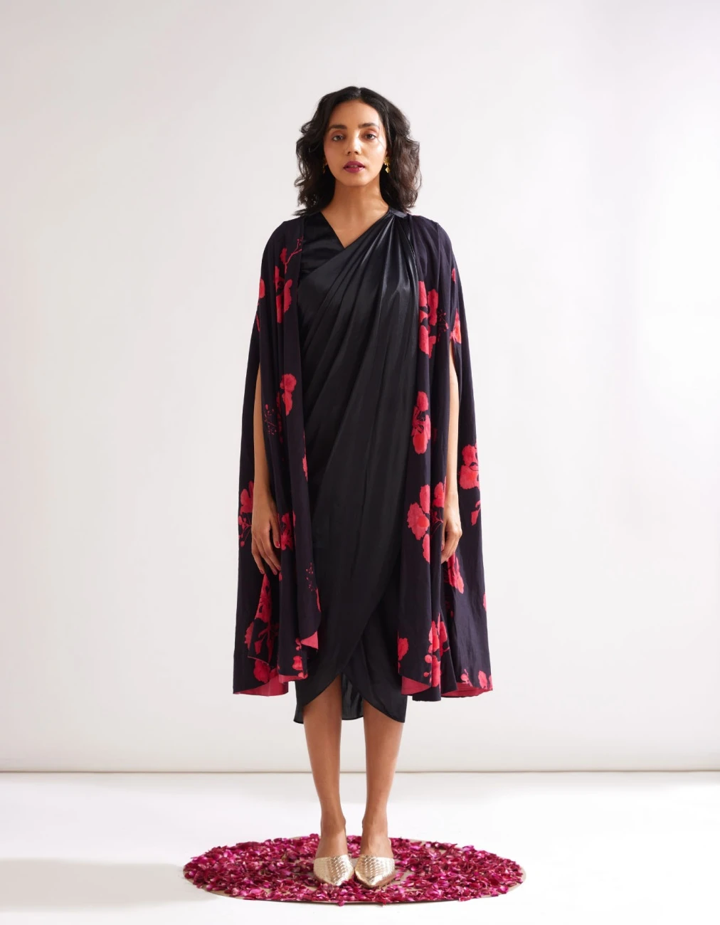 - Pleated shoulder draped dress with Gulmohar cape- Rich black
