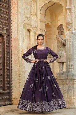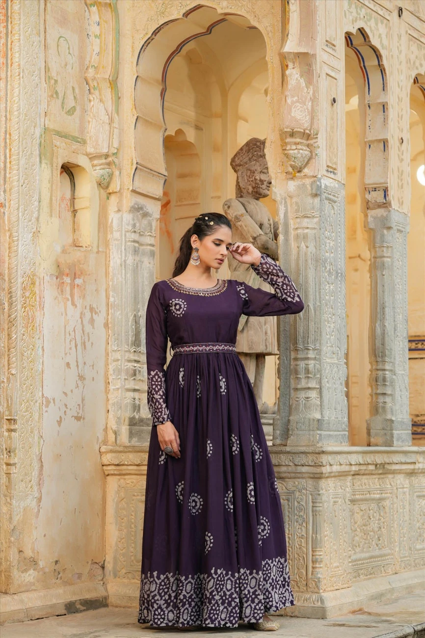 Be the first to review “Purple Chinon Silk Block Print Anarkali Dress With Embroidered Belt” Cancel reply