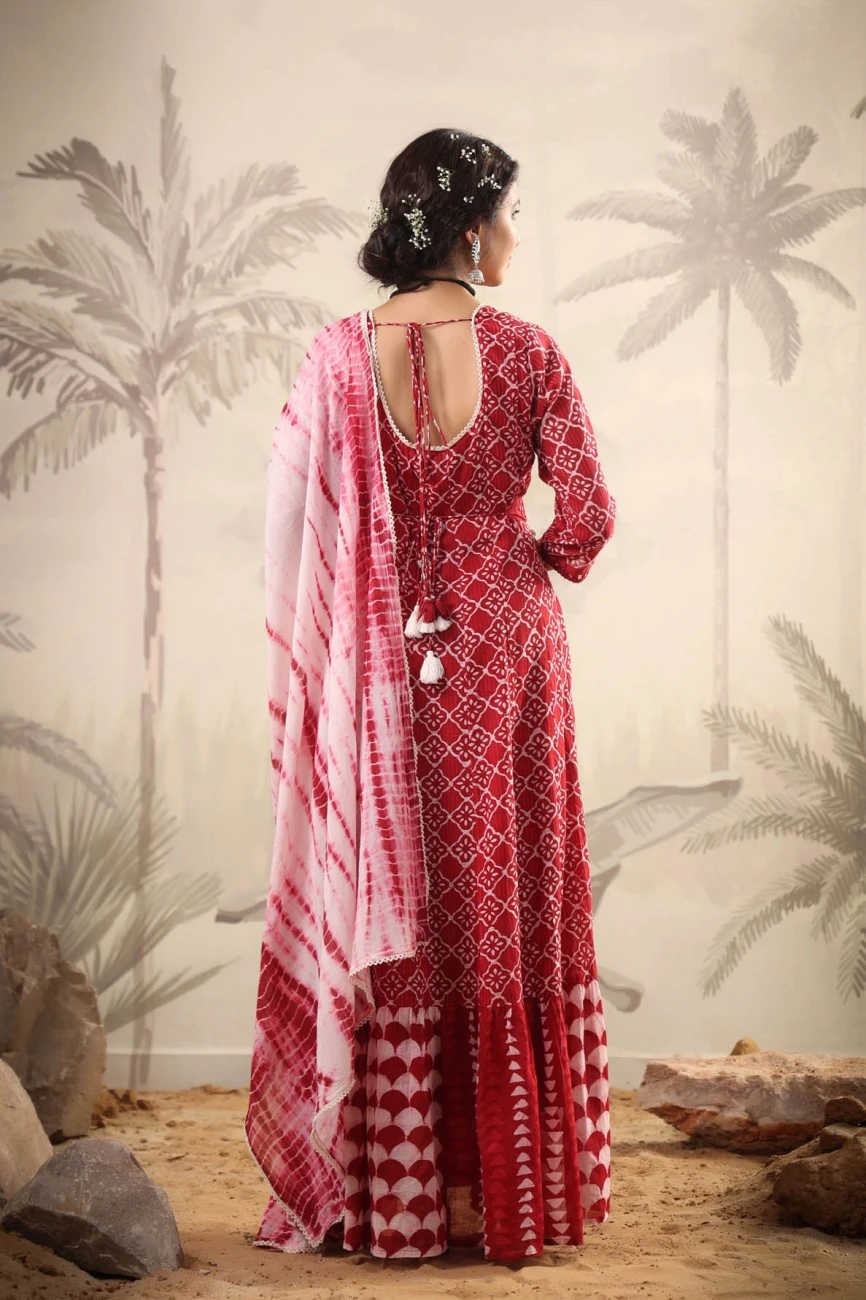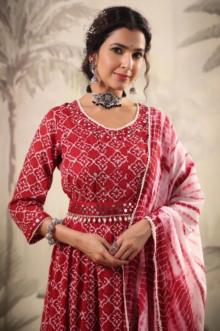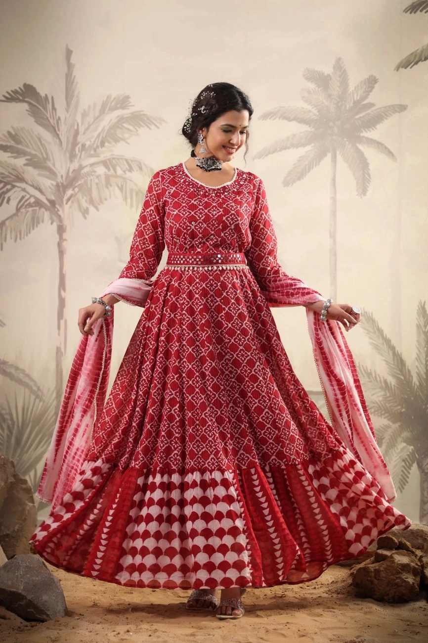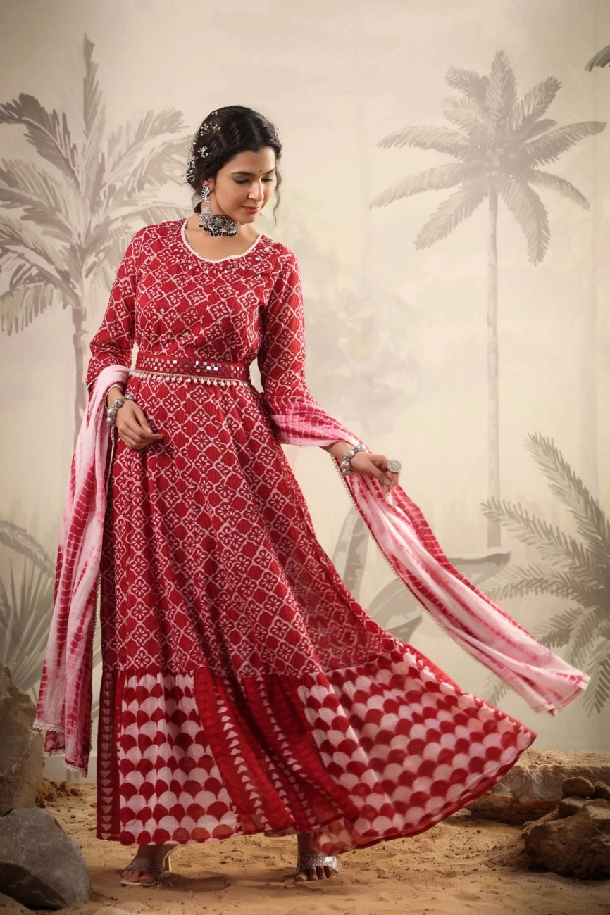 - Red Mul Cotton Tribal Print Anarkali Ethnic Dress With Mul Shibori Print Dupatta And Belt