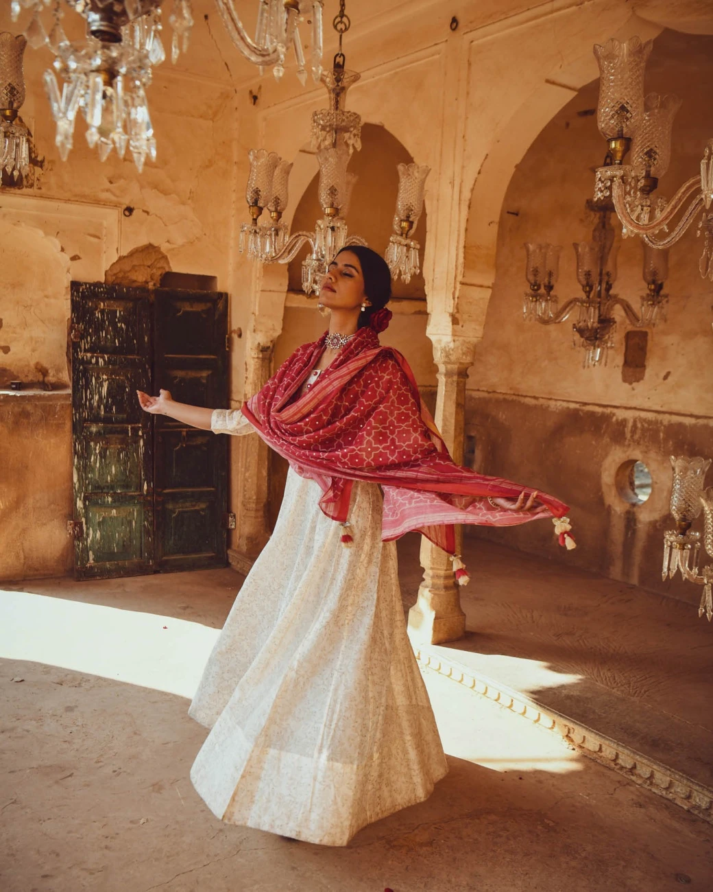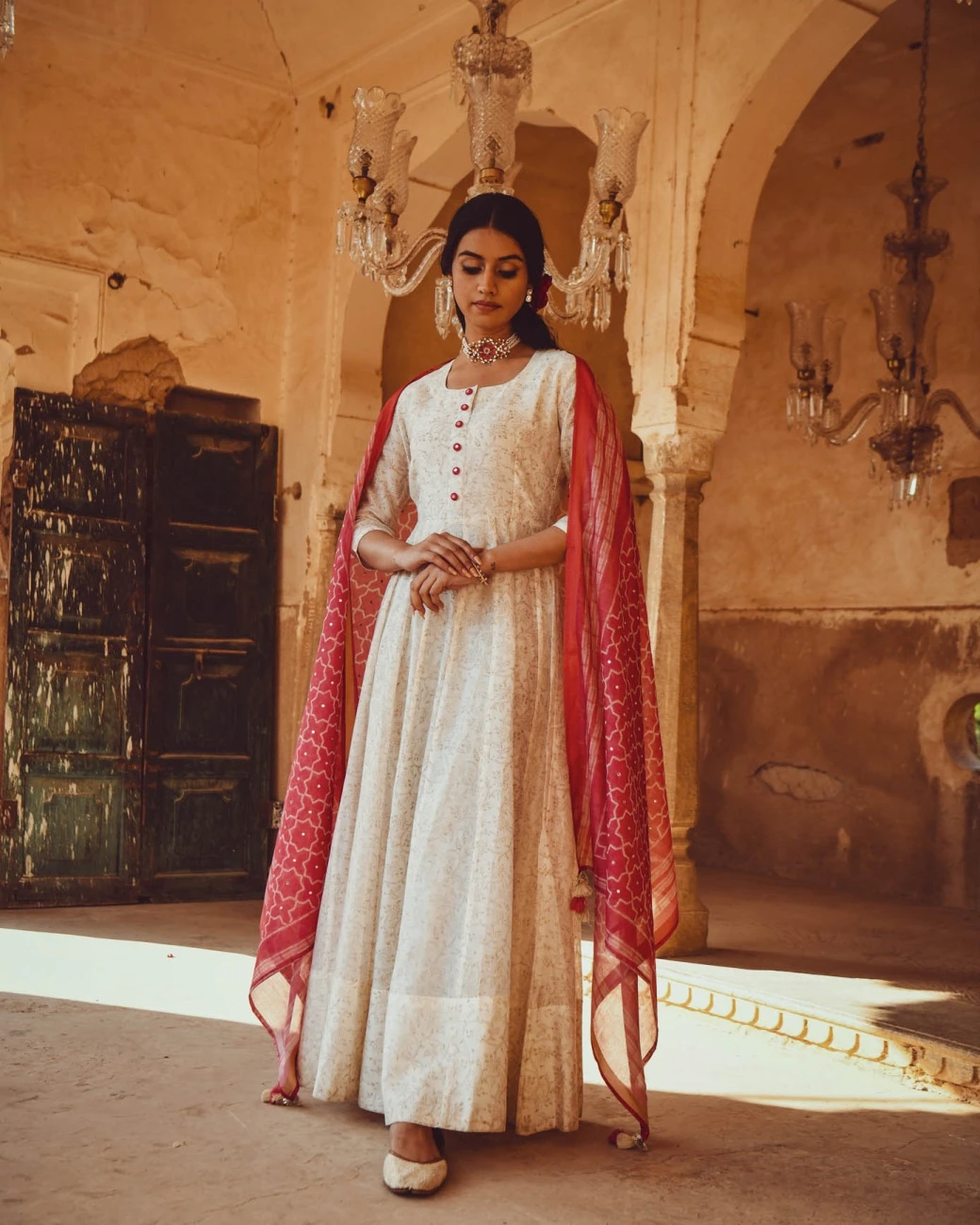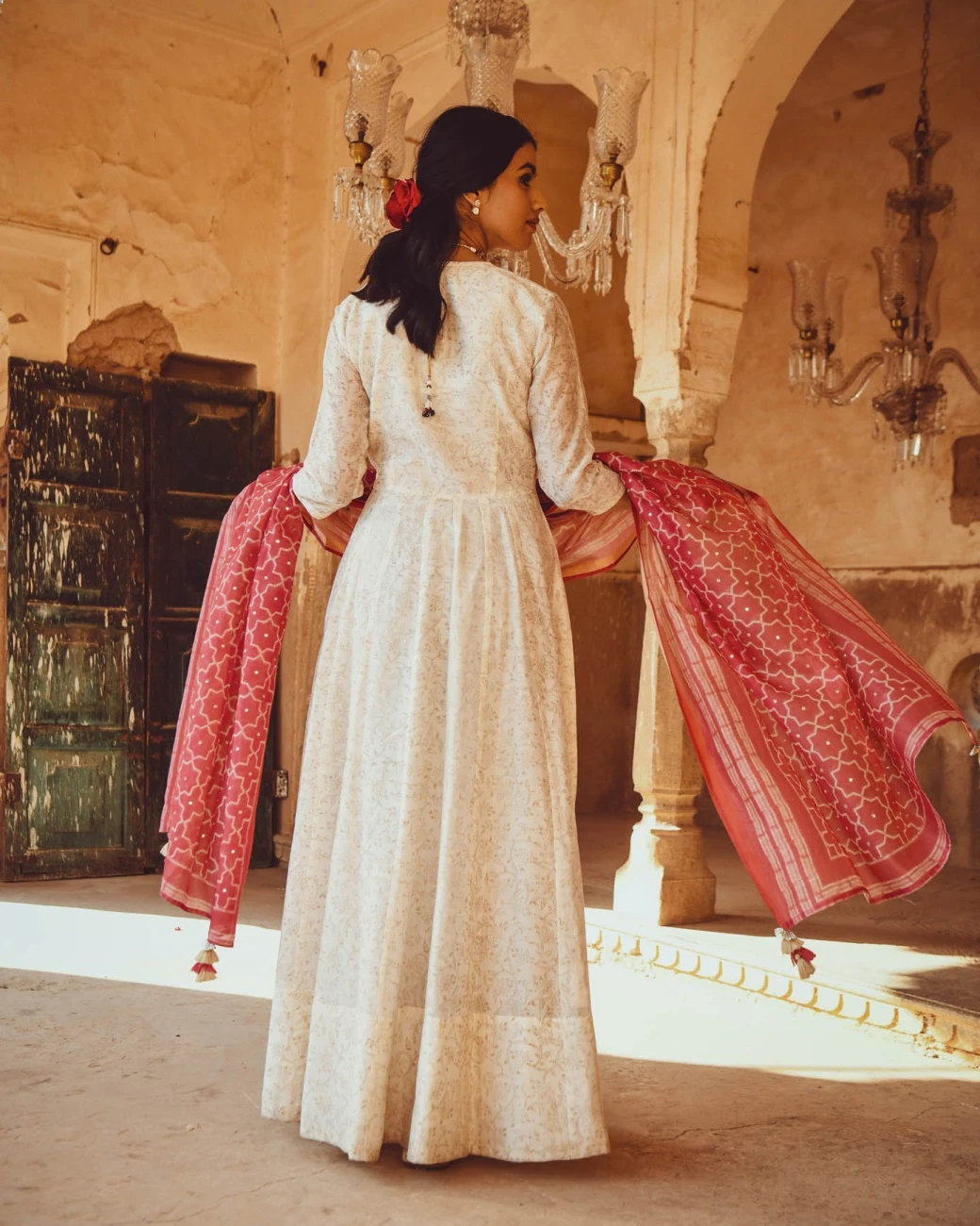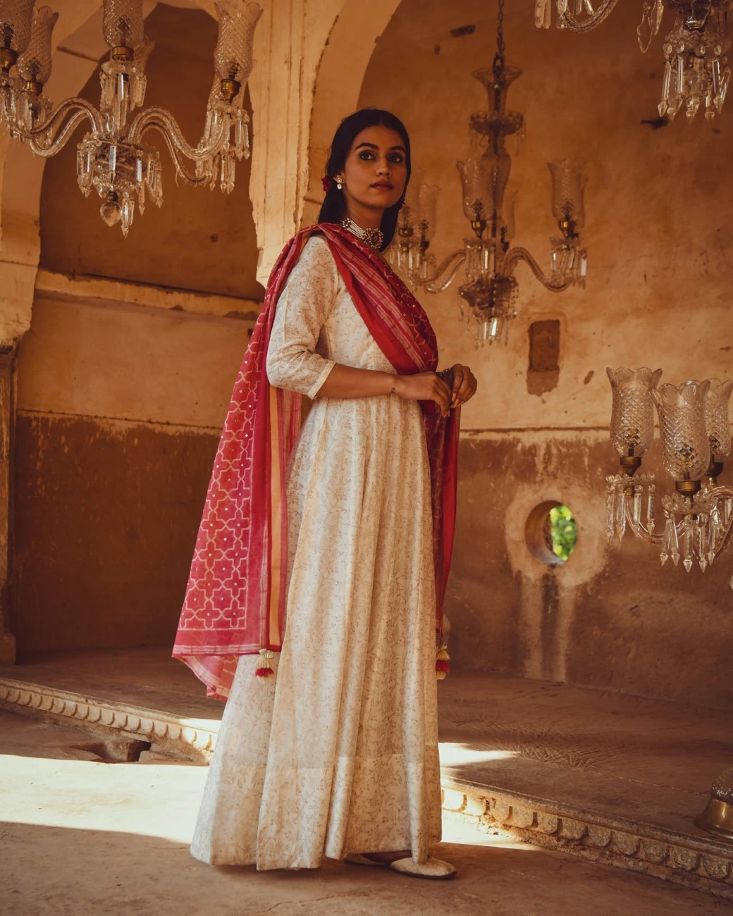 - Screen Printed Anarkali Dress Complimented With Mirror Work Chanderi Dupatta And Cotton Pants