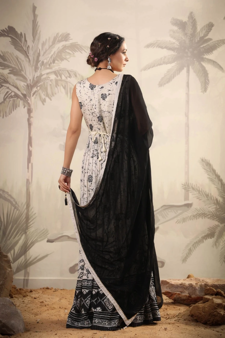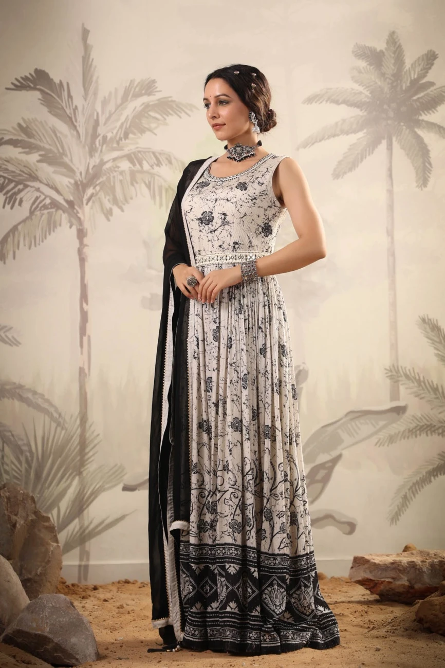 - White Pure Chinon Silk Digital Floral Print Pleated Anarkali Dress With Chiffon Dupatta And Belt