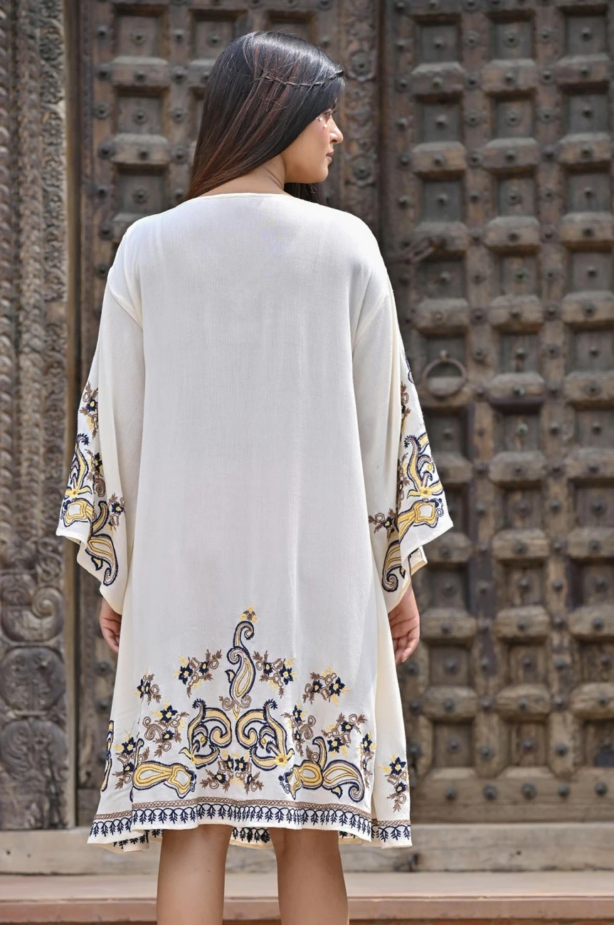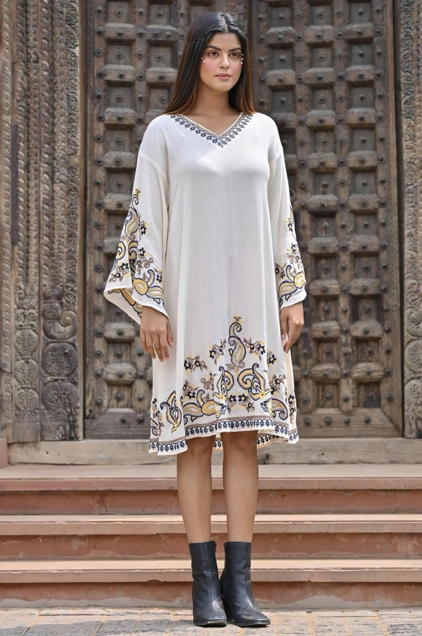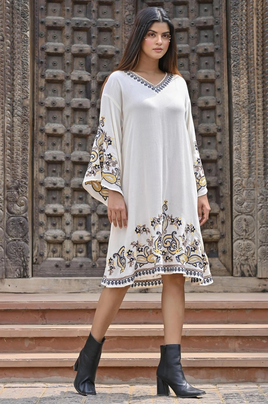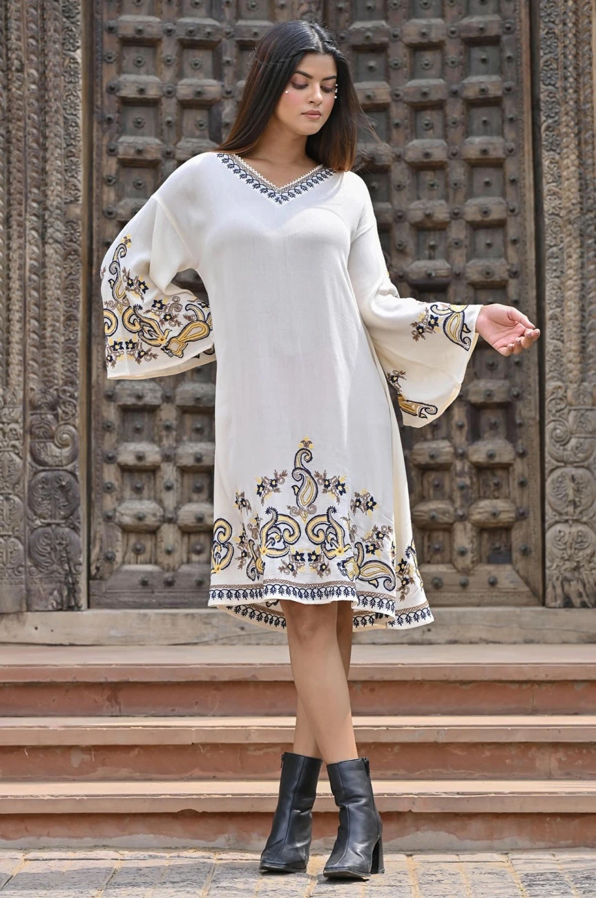 White Rayon Crepe Embroidered Short Dress