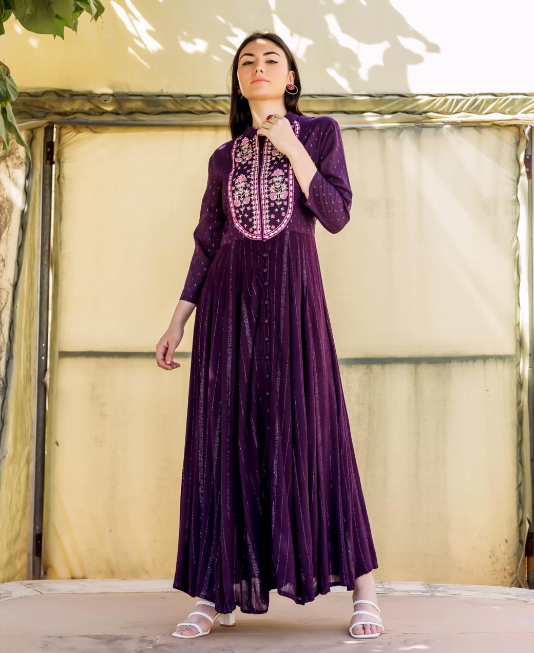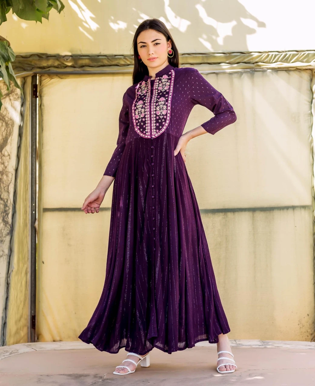 Be the first to review “Wine Lurex Embroidered Anarkali Dress” Cancel reply