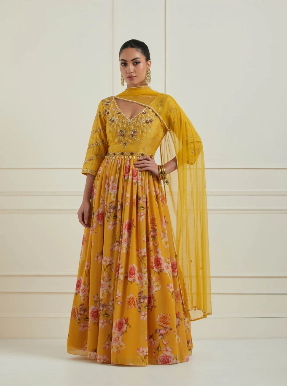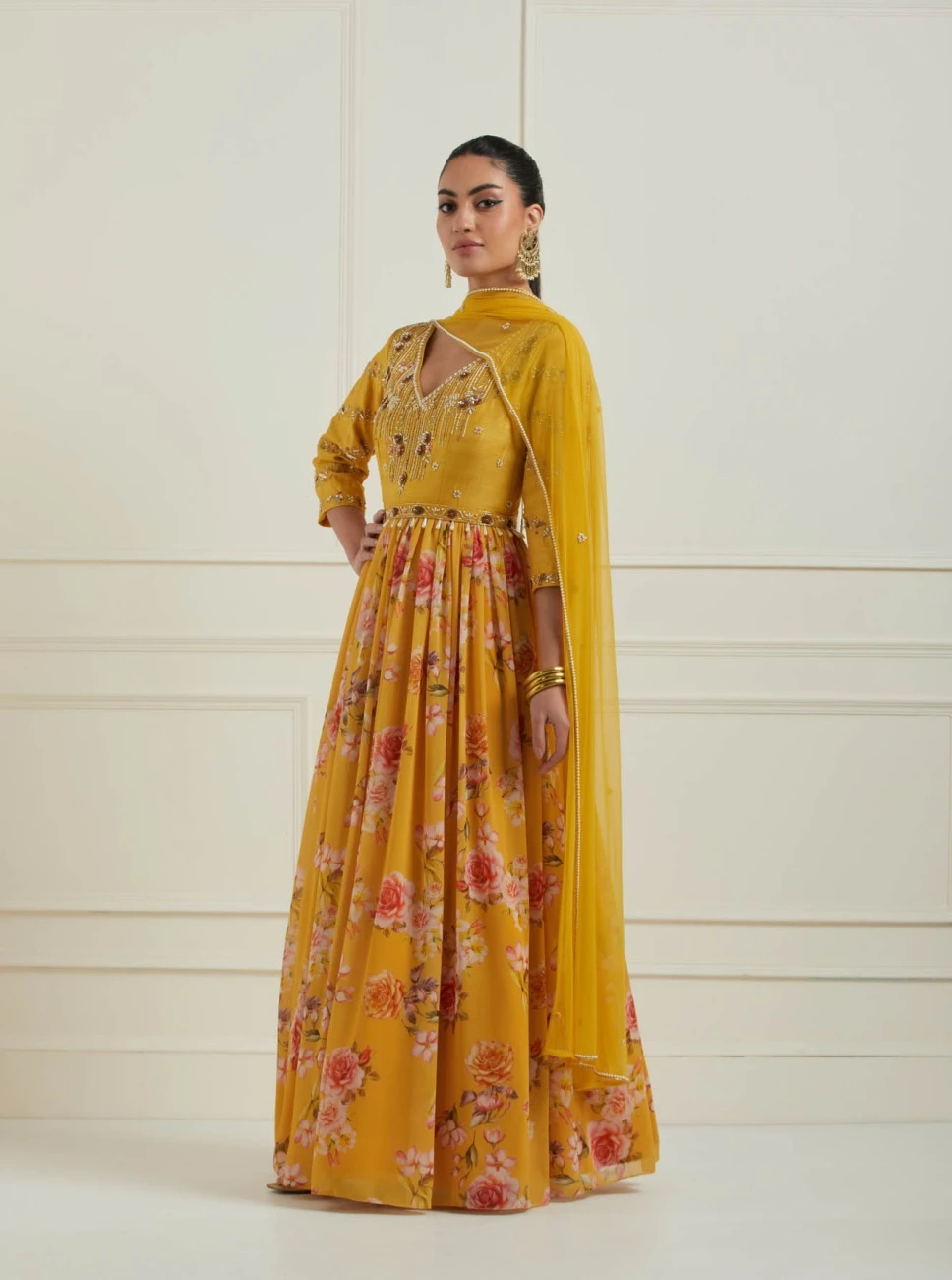 White Pure Chinon Silk Digital Floral Print Pleated Anarkali Dress With Chiffon Dupatta And Belt